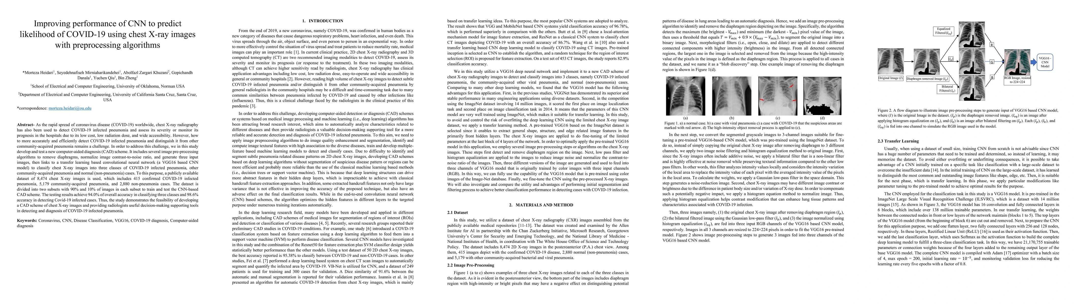 This study develops a computer-aided diagnosis scheme using a CNN model with preprocessing algorithms to classify chest X-ray images into COVID-19 infected pneumonia, other community-acquired pneumonia, and normal cases. The proposed method achieves 94.0% overall accuracy and 98.6% accuracy in detecting COVID-19 infected pneumonia, demonstrating its potential to assist radiologists in diagnosing COVID-19.