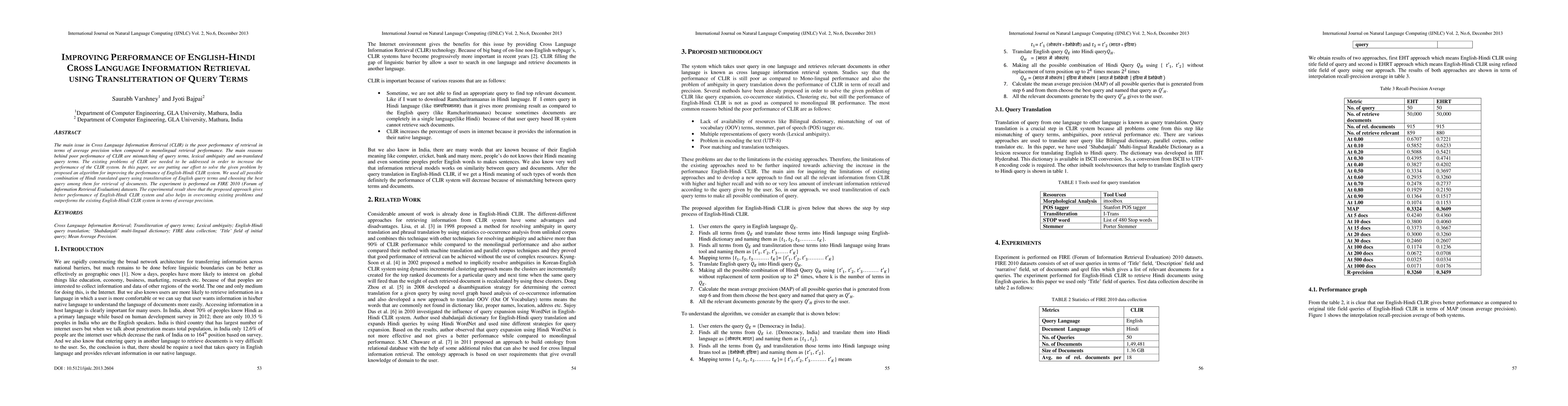 This paper proposes an algorithm to enhance English-Hindi Cross Language Information Retrieval (CLIR) performance by using transliteration of English query terms into Hindi, which helps to address issues like query term mismatches and lexical ambiguity. Experimental results on FIRE 2010 datasets show improved average precision over existing CLIR systems.