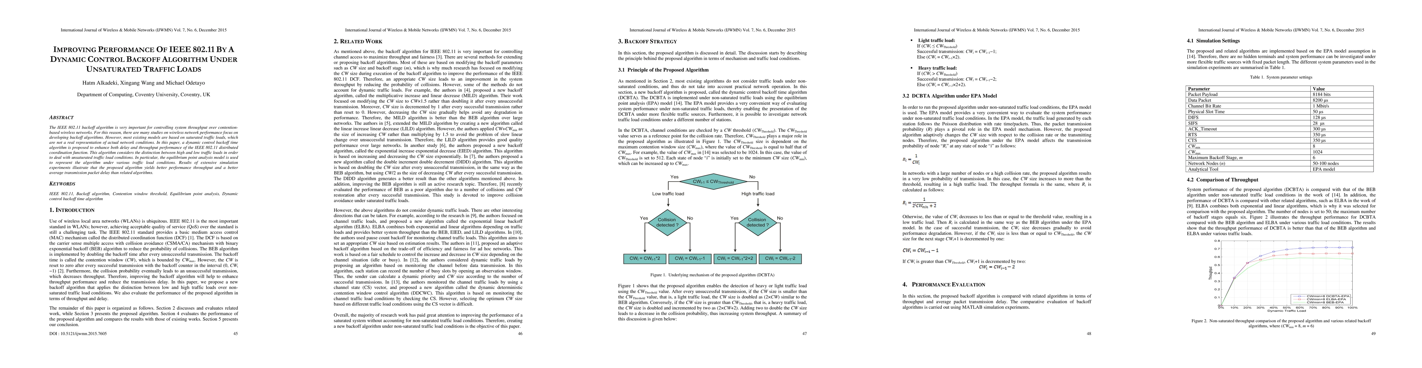 The IEEE 802.11 backoff algorithm is very important for controlling system throughput over contentionbased wireless networks. For this reason, there are many studies on wireless network performance focus on developing backoff algorithms. However, most existing models are based on saturated traffic loads, which are not a real representation of actual network conditions. In this paper, a dynamic control backoff time algorithm is proposed to enhance both delay and throughput performance of the IEEE 802.11 distributed coordination function. This algorithm considers the distinction between high and low traffic loads in order to deal with unsaturated traffic load conditions. In particular, the equilibrium point analysis model is used to represent the algorithm under various traffic load conditions. Results of extensive simulation experiments illustrate that the proposed algorithm yields better performance throughput and a better average transmission packet delay than related algorithms.