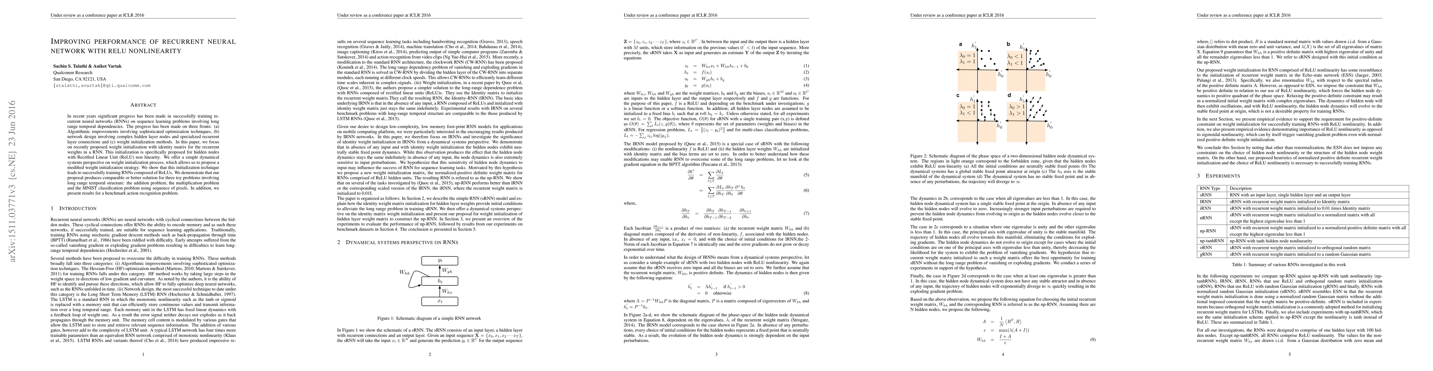 In recent years significant progress has been made in successfully training recurrent neural networks (RNNs) on sequence learning problems involving long range temporal dependencies. The progress has been made on three fronts: (a) Algorithmic improvements involving sophisticated optimization techniques, (b) network design involving complex hidden layer nodes and specialized recurrent layer connections and (c) weight initialization methods. In this paper, we focus on recently proposed weight initialization with identity matrix for the recurrent weights in a RNN. This initialization is specifically proposed for hidden nodes with Rectified Linear Unit (ReLU) non linearity. We offer a simple dynamical systems perspective on weight initialization process, which allows us to propose a modified weight initialization strategy. We show that this initialization technique leads to successfully training RNNs composed of ReLUs. We demonstrate that our proposal produces comparable or better solution for three toy problems involving long range temporal structure: the addition problem, the multiplication problem and the MNIST classification problem using sequence of pixels. In addition, we present results for a benchmark action recognition problem.