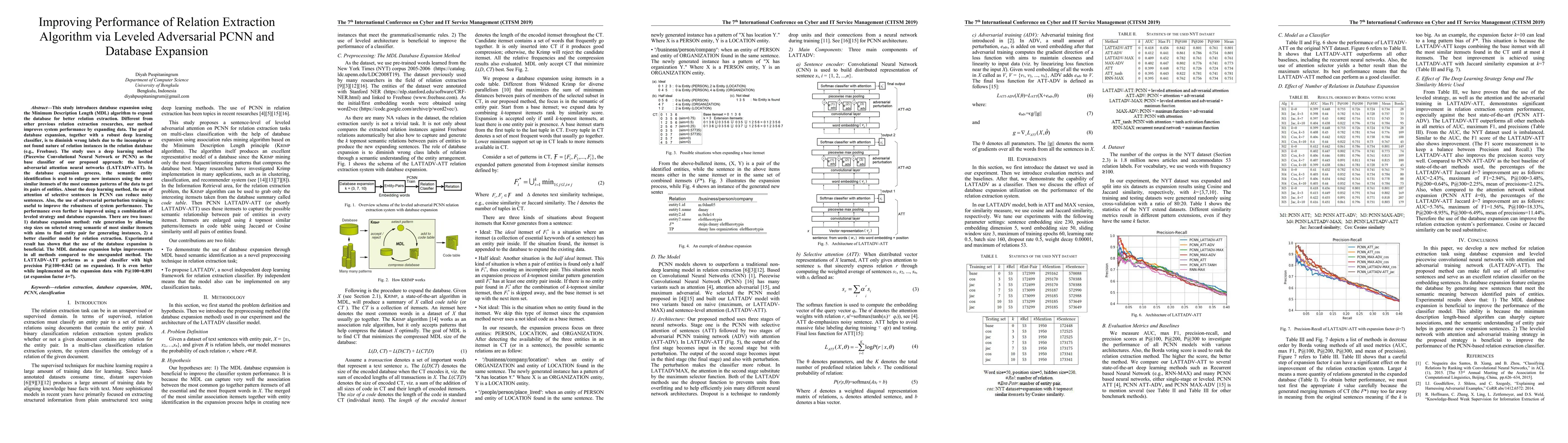 This study introduces database expansion using the Minimum Description Length (MDL) algorithm to expand the database for better relation extraction. Different from other previous relation extraction researches, our method improves system performance by expanding data. The goal of database expansion, together with a robust deep learning classifier, is to diminish wrong labels due to the incomplete or not found nature of relation instances in the relation database (e.g., Freebase). The study uses a deep learning method (Piecewise Convolutional Neural Network or PCNN) as the base classifier of our proposed approach: the leveled adversarial attention neural networks (LATTADV-ATT). In the database expansion process, the semantic entity identification is used to enlarge new instances using the most similar itemsets of the most common patterns of the data to get its pairs of entities. About the deep learning method, the use of attention of selective sentences in PCNN can reduce noisy sentences. Also, the use of adversarial perturbation training is useful to improve the robustness of system performance. The performance even further is improved using a combination of leveled strategy and database expansion. There are two issues: 1) database expansion method: rule generation by allowing step sizes on selected strong semantic of most similar itemsets with aims to find entity pair for generating instances, 2) a better classifier model for relation extraction. Experimental result has shown that the use of the database expansion is beneficial. The MDL database expansion helps improvements in all methods compared to the unexpanded method. The LATTADV-ATT performs as a good classifier with high precision P@100=0.842 (at no expansion). It is even better while implemented on the expansion data with P@100=0.891 (at expansion factor k=7).