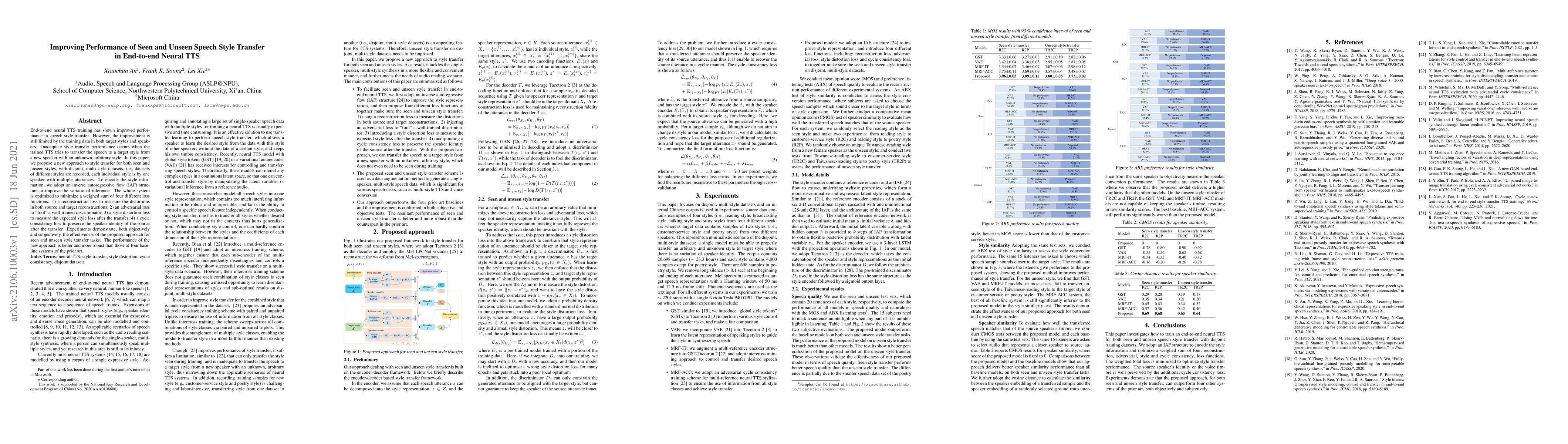 End-to-end neural TTS training has shown improved performance in speech style transfer. However, the improvement is still limited by the training data in both target styles and speakers. Inadequate style transfer performance occurs when the trained TTS tries to transfer the speech to a target style from a new speaker with an unknown, arbitrary style. In this paper, we propose a new approach to style transfer for both seen and unseen styles, with disjoint, multi-style datasets, i.e., datasets of different styles are recorded, each individual style is by one speaker with multiple utterances. To encode the style information, we adopt an inverse autoregressive flow (IAF) structure to improve the variational inference. The whole system is optimized to minimize a weighed sum of four different loss functions: 1) a reconstruction loss to measure the distortions in both source and target reconstructions; 2) an adversarial loss to "fool" a well-trained discriminator; 3) a style distortion loss to measure the expected style loss after the transfer; 4) a cycle consistency loss to preserve the speaker identity of the source after the transfer. Experiments demonstrate, both objectively and subjectively, the effectiveness of the proposed approach for seen and unseen style transfer tasks. The performance of the new approach is better and more robust than those of four baseline systems of the prior art.