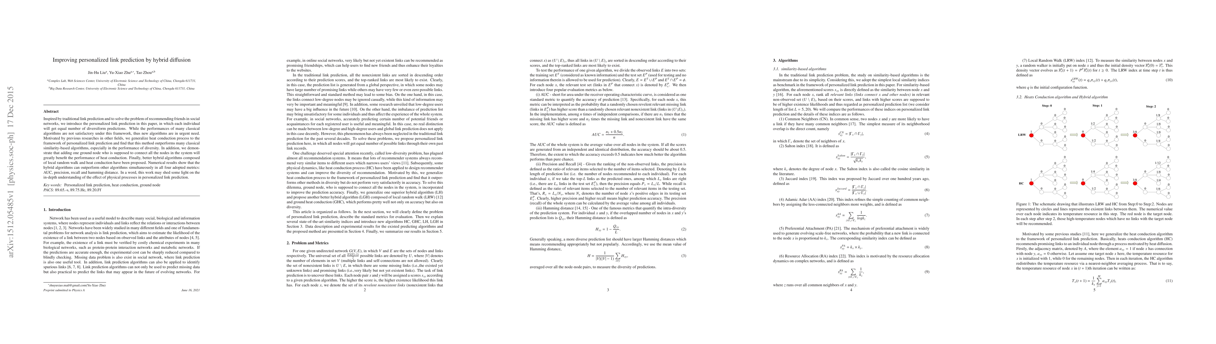 A new method for personalized link prediction, inspired by heat conduction, outperforms traditional similarity-based algorithms in terms of diversity and overall performance. Hybrid algorithms combining local random walk and heat conduction also show significant advantages.