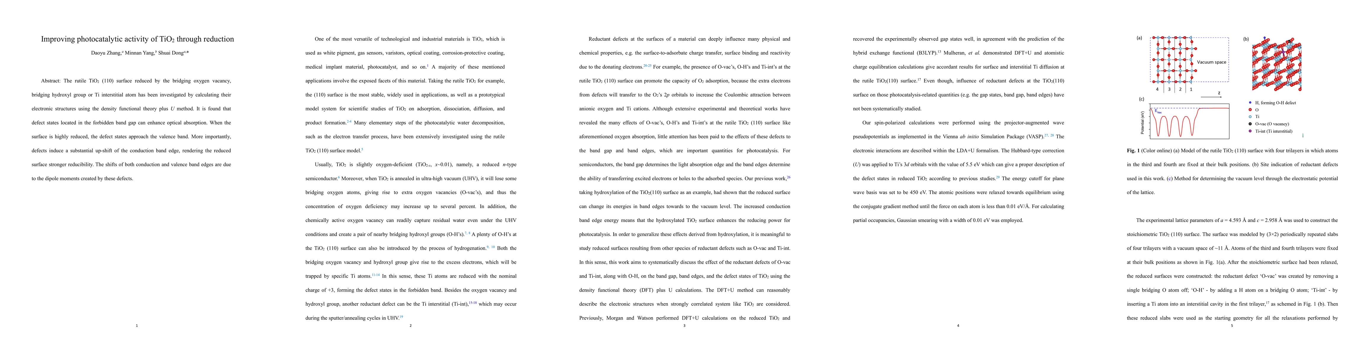 The rutile TiO$_2$ (110) surface reduced by the bridging oxygen vacancy, bridging hydroxyl group or Ti interstitial atom has been investigated by calculating their electronic structures using the density functional theory plus U method. It is found that defect states located in the forbidden band gap can enhance optical absorption. When the surface is highly reduced, the defect states approach the valence band. More importantly, defects induce a substantial up-shift of the conduction band edge, rendering the reduced surface stronger reducibility. The shifts of both conduction and valence band edges are due to the dipole moments created by these defects.