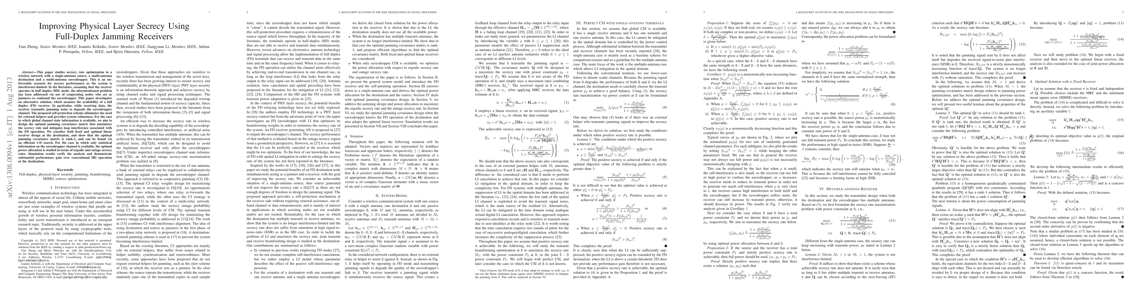 This paper studies secrecy rate optimization in a wireless network with a single-antenna source, a multi-antenna destination and a multi-antenna eavesdropper. This is an unfavorable scenario for secrecy performance as the system is interference-limited. In the literature, assuming that the receiver operates in half duplex (HD) mode, the aforementioned problem has been addressed via use of cooperating nodes who act as jammers to confound the eavesdropper. This paper investigates an alternative solution, which assumes the availability of a full duplex (FD) receiver. In particular, while receiving data, the receiver transmits jamming noise to degrade the eavesdropper channel. The proposed self-protection scheme eliminates the need for external helpers and provides system robustness. For the case in which global channel state information is available, we aim to design the optimal jamming covariance matrix that maximizes the secrecy rate and mitigates loop interference associated with the FD operation. We consider both fixed and optimal linear receiver design at the destination, and show that the optimal jamming covariance matrix is rank-1, and can be found via an efficient 1-D search. For the case in which only statistical information on the eavesdropper channel is available, the optimal power allocation is studied in terms of ergodic and outage secrecy rates. Simulation results verify the analysis and demonstrate substantial performance gain over conventional HD operation at the destination.