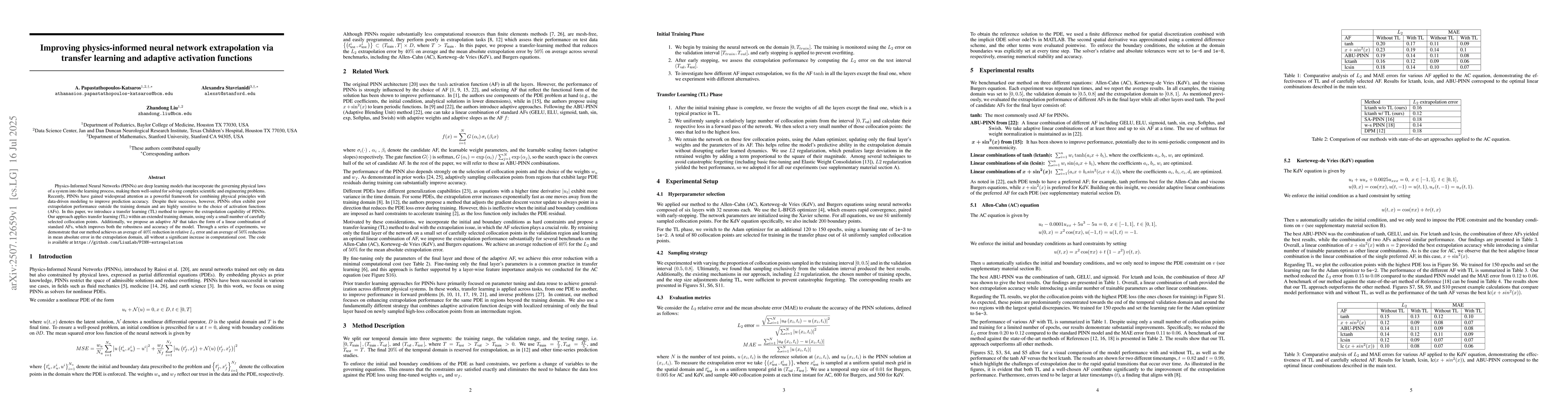 Physics-Informed Neural Networks (PINNs) are deep learning models that incorporate the governing physical laws of a system into the learning process, making them well-suited for solving complex scientific and engineering problems. Recently, PINNs have gained widespread attention as a powerful framework for combining physical principles with data-driven modeling to improve prediction accuracy. Despite their successes, however, PINNs often exhibit poor extrapolation performance outside the training domain and are highly sensitive to the choice of activation functions (AFs). In this paper, we introduce a transfer learning (TL) method to improve the extrapolation capability of PINNs. Our approach applies transfer learning (TL) within an extended training domain, using only a small number of carefully selected collocation points. Additionally, we propose an adaptive AF that takes the form of a linear combination of standard AFs, which improves both the robustness and accuracy of the model. Through a series of experiments, we demonstrate that our method achieves an average of 40% reduction in relative L2 error and an average of 50% reduction in mean absolute error in the extrapolation domain, all without a significant increase in computational cost. The code is available at https://github.com/LiuzLab/PINN-extrapolation .