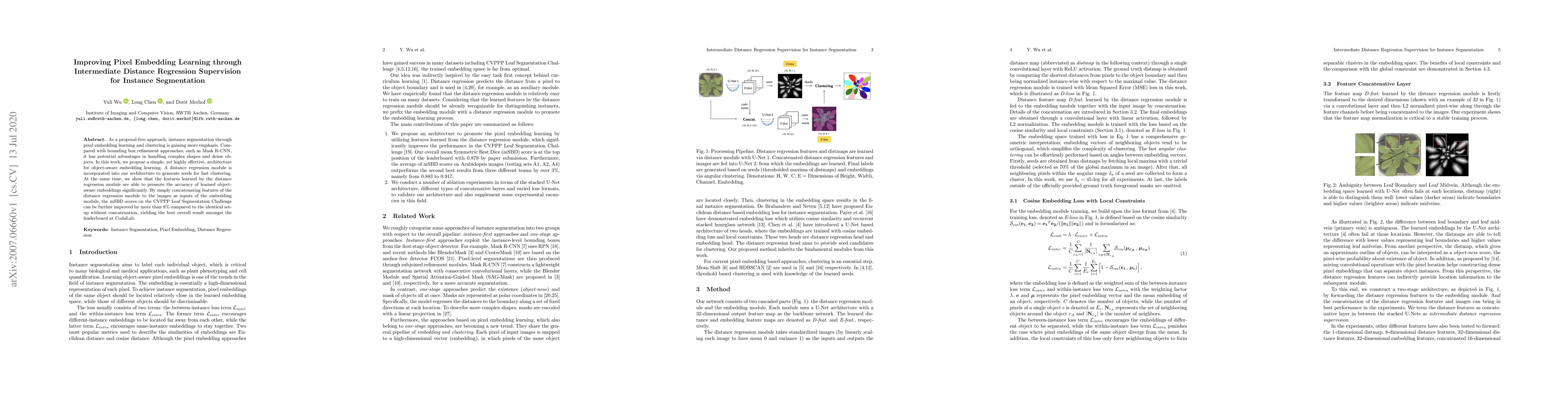 This research introduces a simple yet effective architecture for instance segmentation using pixel embedding learning. It incorporates a distance regression module to generate seeds for clustering, improving object-aware embedding accuracy. The method outperforms previous techniques, enhancing mSBD scores by over 8% on the CVPPP Leaf Segmentation Challenge.
