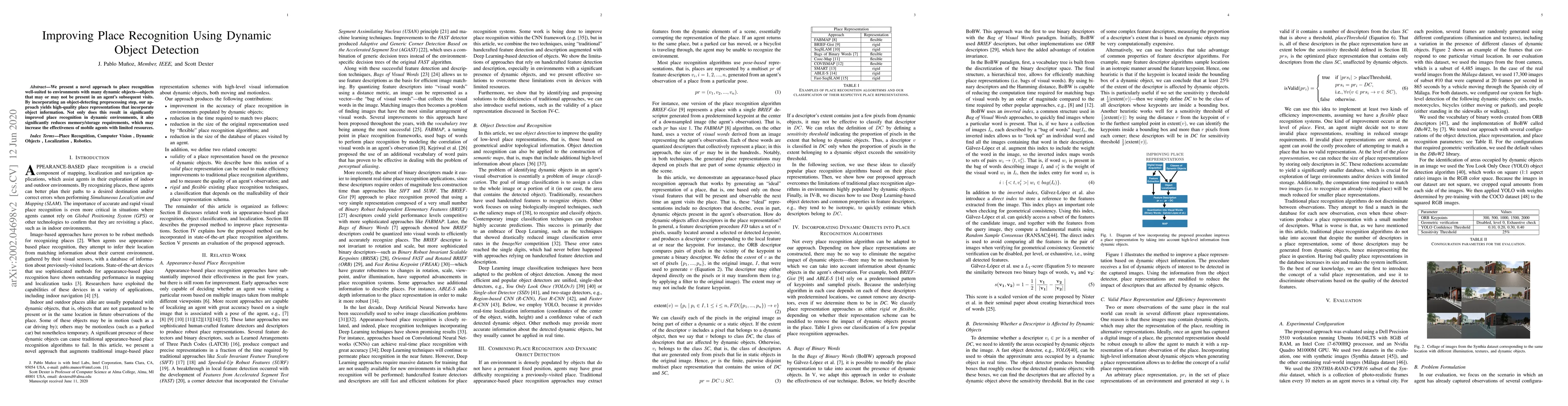 We present a novel approach to place recognition well-suited to environments with many dynamic objects--objects that may or may not be present in an agent's subsequent visits. By incorporating an object-detecting preprocessing step, our approach yields high-quality place representations that incorporate object information. Not only does this result in significantly improved place recognition in dynamic environments, it also significantly reduces memory/storage requirements, which may increase the effectiveness of mobile agents with limited resources.