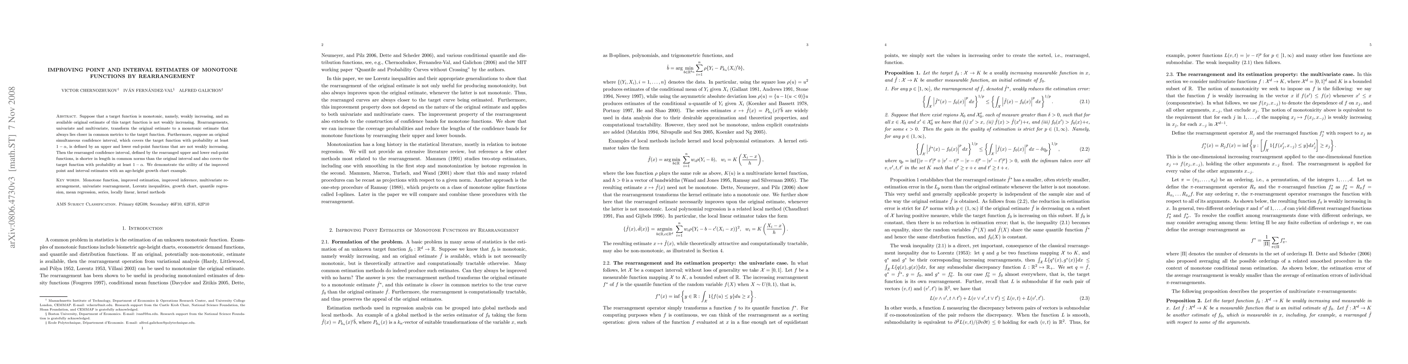 Suppose that a target function is monotonic, namely, weakly increasing, and an available original estimate of this target function is not weakly increasing. Rearrangements, univariate and multivariate, transform the original estimate to a monotonic estimate that always lies closer in common metrics to the target function. Furthermore, suppose an original simultaneous confidence interval, which covers the target function with probability at least $1-\alpha$, is defined by an upper and lower end-point functions that are not weakly increasing. Then the rearranged confidence interval, defined by the rearranged upper and lower end-point functions, is shorter in length in common norms than the original interval and also covers the target function with probability at least $1-\alpha$. We demonstrate the utility of the improved point and interval estimates with an age-height growth chart example.