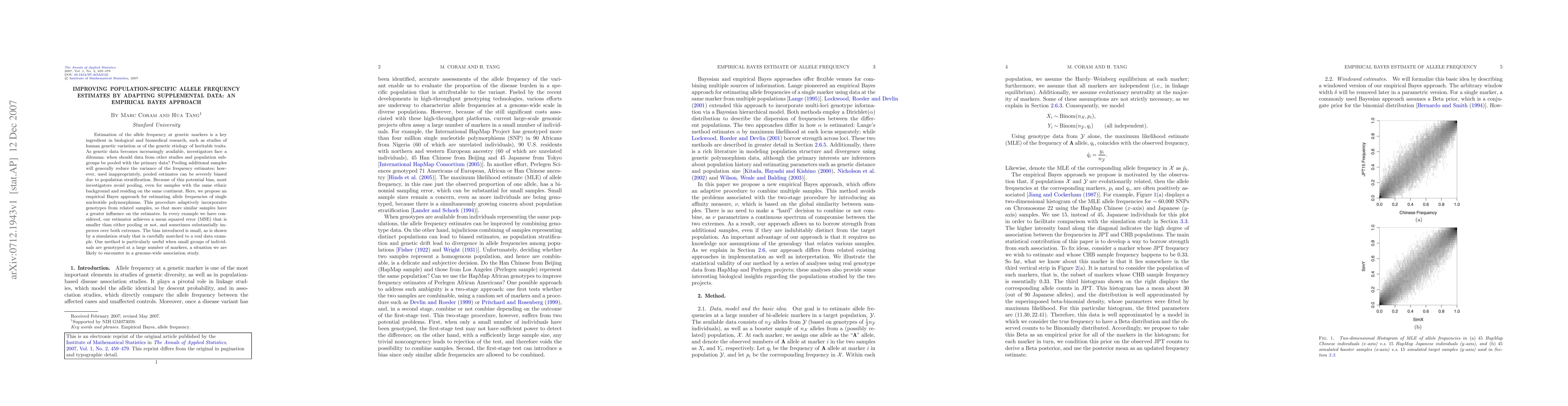 Estimation of the allele frequency at genetic markers is a key ingredient in biological and biomedical research, such as studies of human genetic variation or of the genetic etiology of heritable traits. As genetic data becomes increasingly available, investigators face a dilemma: when should data from other studies and population subgroups be pooled with the primary data? Pooling additional samples will generally reduce the variance of the frequency estimates; however, used inappropriately, pooled estimates can be severely biased due to population stratification. Because of this potential bias, most investigators avoid pooling, even for samples with the same ethnic background and residing on the same continent. Here, we propose an empirical Bayes approach for estimating allele frequencies of single nucleotide polymorphisms. This procedure adaptively incorporates genotypes from related samples, so that more similar samples have a greater influence on the estimates. In every example we have considered, our estimator achieves a mean squared error (MSE) that is smaller than either pooling or not, and sometimes substantially improves over both extremes. The bias introduced is small, as is shown by a simulation study that is carefully matched to a real data example. Our method is particularly useful when small groups of individuals are genotyped at a large number of markers, a situation we are likely to encounter in a genome-wide association study.