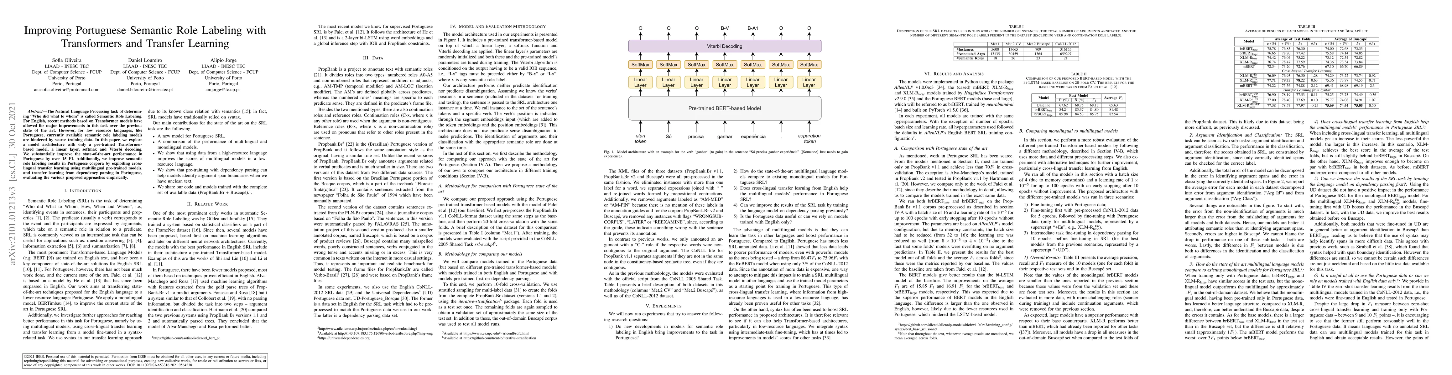 This paper improves Portuguese Semantic Role Labeling (SRL) using Transformer models and transfer learning. It enhances state-of-the-art performance by over 15 F1 points, leveraging both multilingual pre-trained models and transfer learning from dependency parsing.