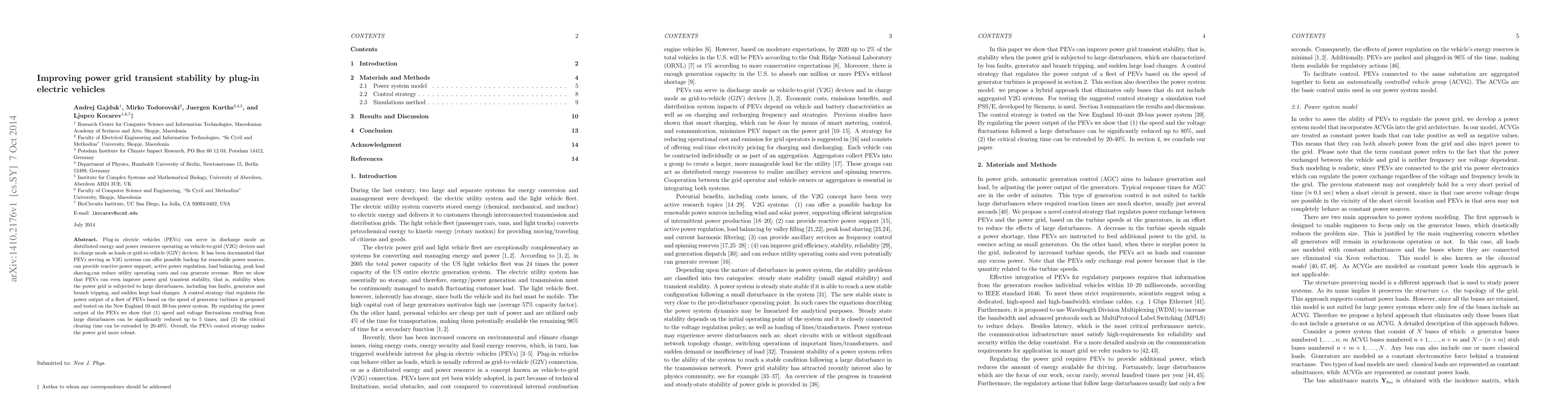 Plug-in electric vehicles (PEVs) can serve in discharge mode as distributed energy and power resources operating as vehicle-to-grid (V2G) devices and in charge mode as loads or grid-to-vehicle (G2V) devices. It has been documented that PEVs serving as V2G systems can offer possible backup for renewable power sources, can provide reactive power support, active power regulation, load balancing, peak load shaving,% and current harmonic filtering, can provide ancillary services as frequency control and spinning reserves, can improve grid efficiency, stability, reliability, and generation dispatch, can reduce utility operating costs and can generate revenue. Here we show that PEVs can even improve power grid transient stability, that is, stability when the power grid is subjected to large disturbances, including bus faults, generator and branch tripping, and sudden large load changes. A control strategy that regulates the power output of a fleet of PEVs based on the speed of generator turbines is proposed and tested on the New England 10-unit 39-bus power system. By regulating the power output of the PEVs we show that (1) speed and voltage fluctuations resulting from large disturbances can be significantly reduced up to 5 times, and (2) the critical clearing time can be extended by 20-40%. Overall, the PEVs control strategy makes the power grid more robust.