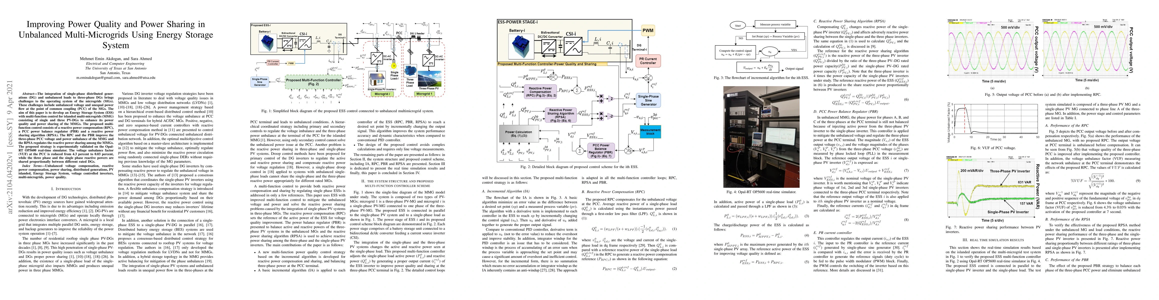 This paper proposes an Energy Storage System (ESS) with multi-function control to improve power quality and power sharing in unbalanced multi-microgrids. The control includes reactive power compensation, a PCC power balance regulator, and a reactive power sharing algorithm, validated to reduce voltage unbalance and achieve proportional reactive power distribution.