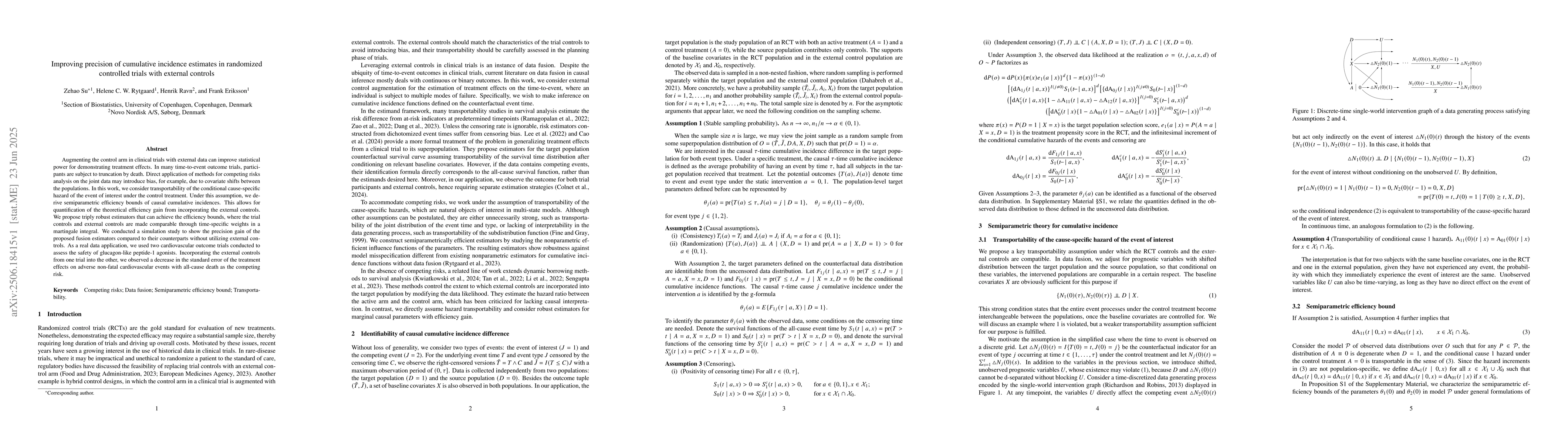 Augmenting the control arm in clinical trials with external data can improve statistical power for demonstrating treatment effects. In many time-to-event outcome trials, participants are subject to truncation by death. Direct application of methods for competing risks analysis on the joint data may introduce bias, for example, due to covariate shifts between the populations. In this work, we consider transportability of the conditional cause-specific hazard of the event of interest under the control treatment. Under this assumption, we derive semiparametric efficiency bounds of causal cumulative incidences. This allows for quantification of the theoretical efficiency gain from incorporating the external controls. We propose triply robust estimators that can achieve the efficiency bounds, where the trial controls and external controls are made comparable through time-specific weights in a martingale integral. We conducted a simulation study to show the precision gain of the proposed fusion estimators compared to their counterparts without utilizing external controls. As a real data application, we used two cardiovascular outcome trials conducted to assess the safety of glucagon-like peptide-1 agonists. Incorporating the external controls from one trial into the other, we observed a decrease in the standard error of the treatment effects on adverse non-fatal cardiovascular events with all-cause death as the competing risk.