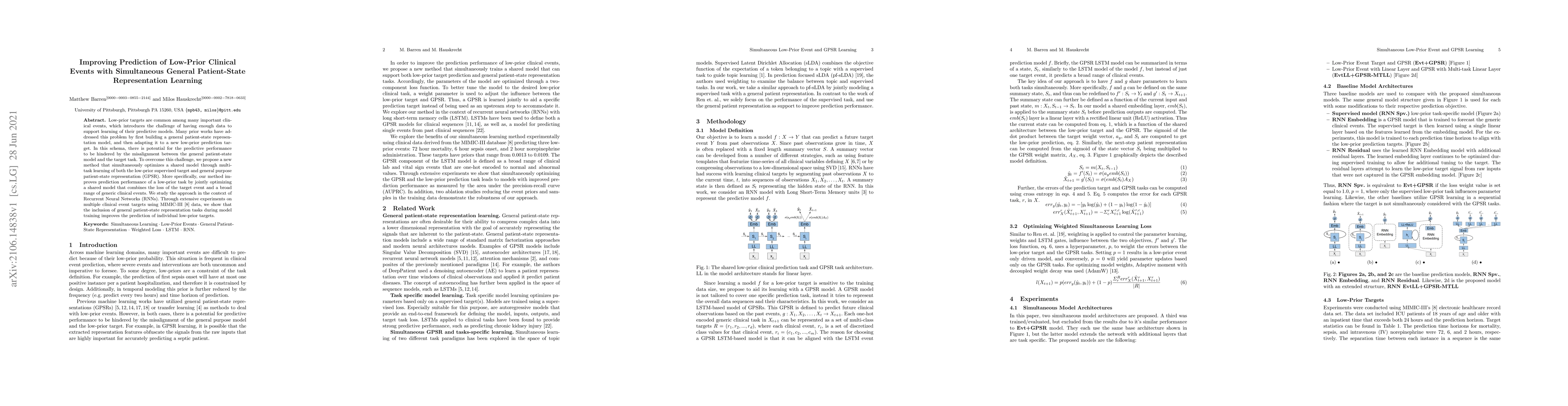 This paper proposes a method to enhance the prediction of low-prior clinical events by simultaneously learning a general patient-state representation through multi-task learning. The approach optimizes a shared model that integrates both the low-prior target and various generic clinical events, demonstrating improved performance over traditional methods.