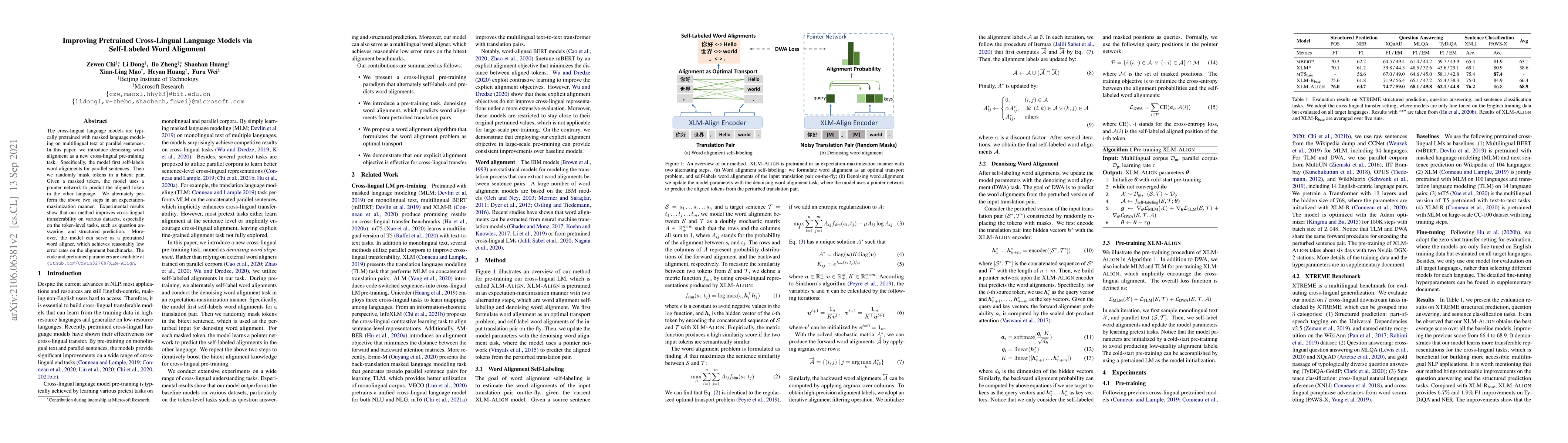 The paper presents XLM-ALIGN, a cross-lingual language model pre-trained with denoising word alignment, which improves cross-lingual transferability for various NLP tasks.