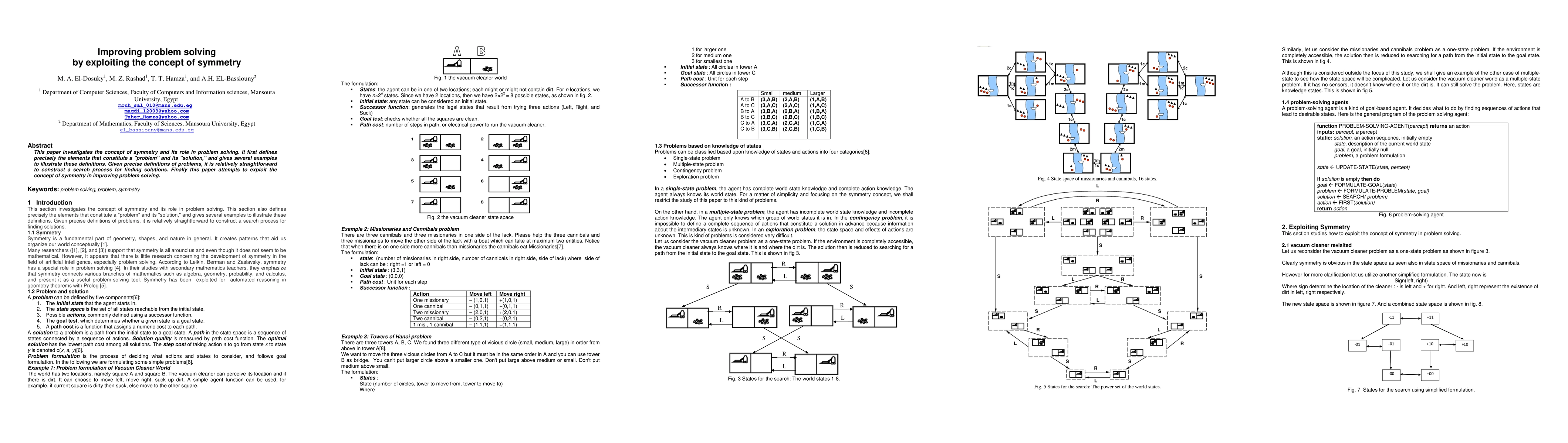 This paper explores how symmetry improves problem solving by providing a clear definition of problems and solutions, and leveraging this concept to develop an efficient search process for finding answers.