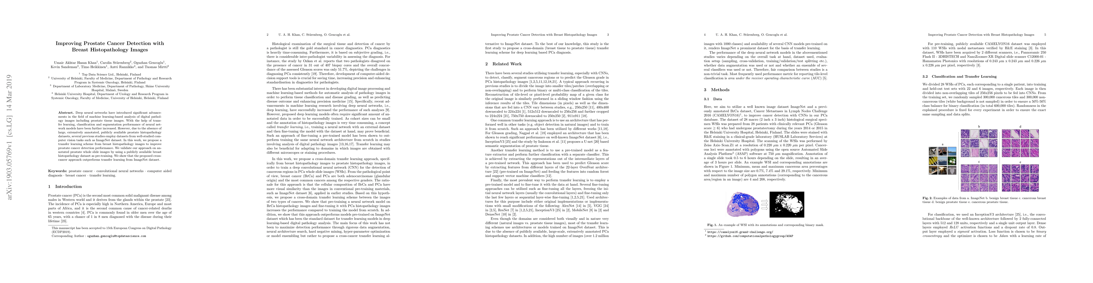 This paper proposes a transfer learning scheme from breast histopathology images to enhance prostate cancer detection, demonstrating improved performance over traditional ImageNet-based transfer learning. The method is validated using annotated prostate whole slide images pre-trained on a publicly available breast histopathology dataset.