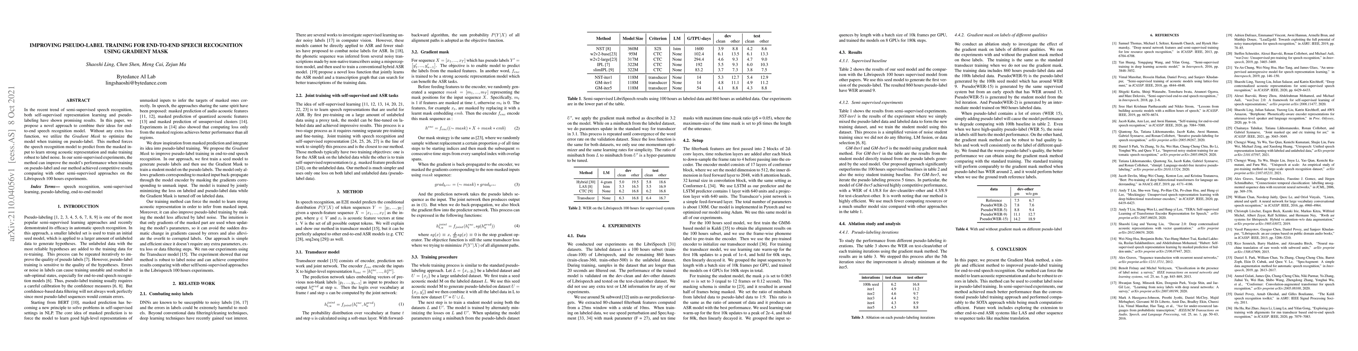 In the recent trend of semi-supervised speech recognition, both self-supervised representation learning and pseudo-labeling have shown promising results. In this paper, we propose a novel approach to combine their ideas for end-to-end speech recognition model. Without any extra loss function, we utilize the Gradient Mask to optimize the model when training on pseudo-label. This method forces the speech recognition model to predict from the masked input to learn strong acoustic representation and make training robust to label noise. In our semi-supervised experiments, the method can improve the model performance when training on pseudo-label and our method achieved competitive results comparing with other semi-supervised approaches on the Librispeech 100 hours experiments.