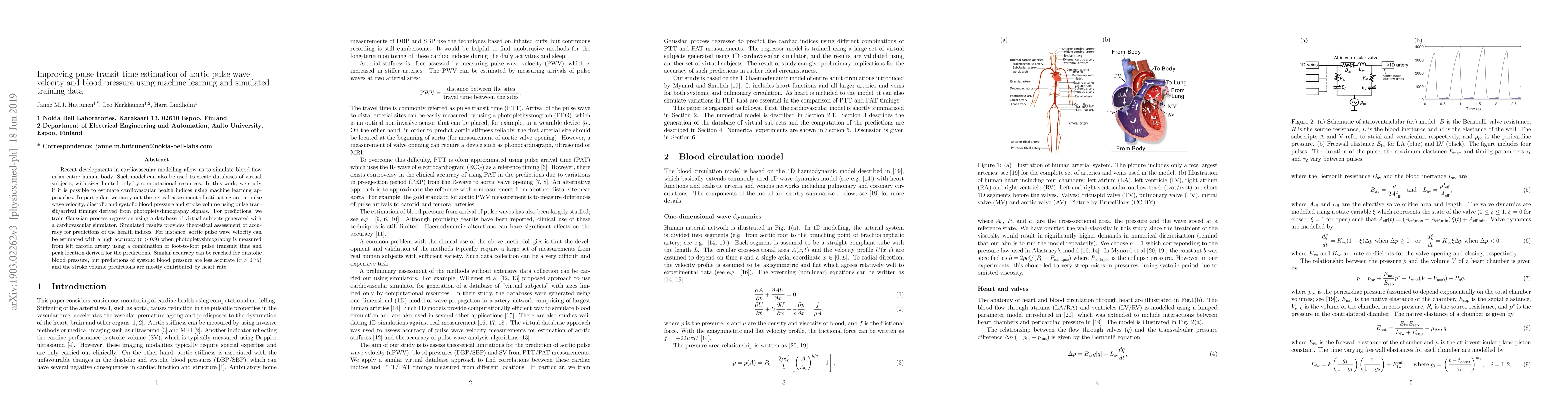 This paper explores the use of machine learning and simulated cardiovascular data to estimate aortic pulse wave velocity, blood pressure, and stroke volume from photoplethysmography signals. The study finds high accuracy (r>0.9) in estimating aortic pulse wave velocity and diastolic blood pressure, but less accuracy (r>0.75) in predicting systolic blood pressure, with stroke volume predictions largely dependent on heart rate.