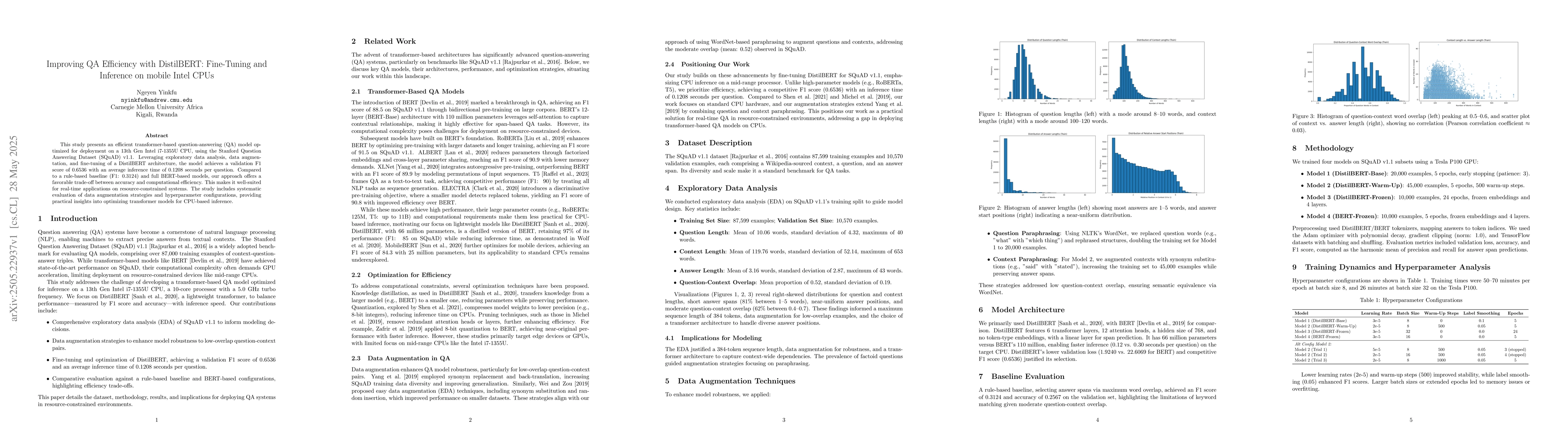 The paper presents an optimized transformer-based QA model using DistilBERT for efficient CPU-based inference on mobile systems.
