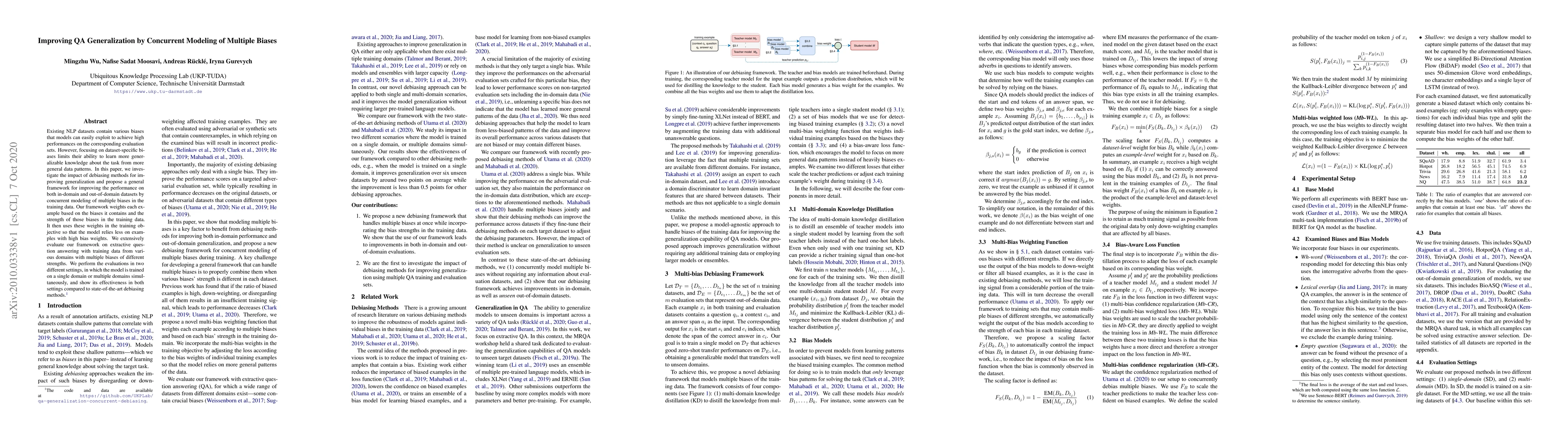 Existing NLP datasets contain various biases that models can easily exploit to achieve high performances on the corresponding evaluation sets. However, focusing on dataset-specific biases limits their ability to learn more generalizable knowledge about the task from more general data patterns. In this paper, we investigate the impact of debiasing methods for improving generalization and propose a general framework for improving the performance on both in-domain and out-of-domain datasets by concurrent modeling of multiple biases in the training data. Our framework weights each example based on the biases it contains and the strength of those biases in the training data. It then uses these weights in the training objective so that the model relies less on examples with high bias weights. We extensively evaluate our framework on extractive question answering with training data from various domains with multiple biases of different strengths. We perform the evaluations in two different settings, in which the model is trained on a single domain or multiple domains simultaneously, and show its effectiveness in both settings compared to state-of-the-art debiasing methods.