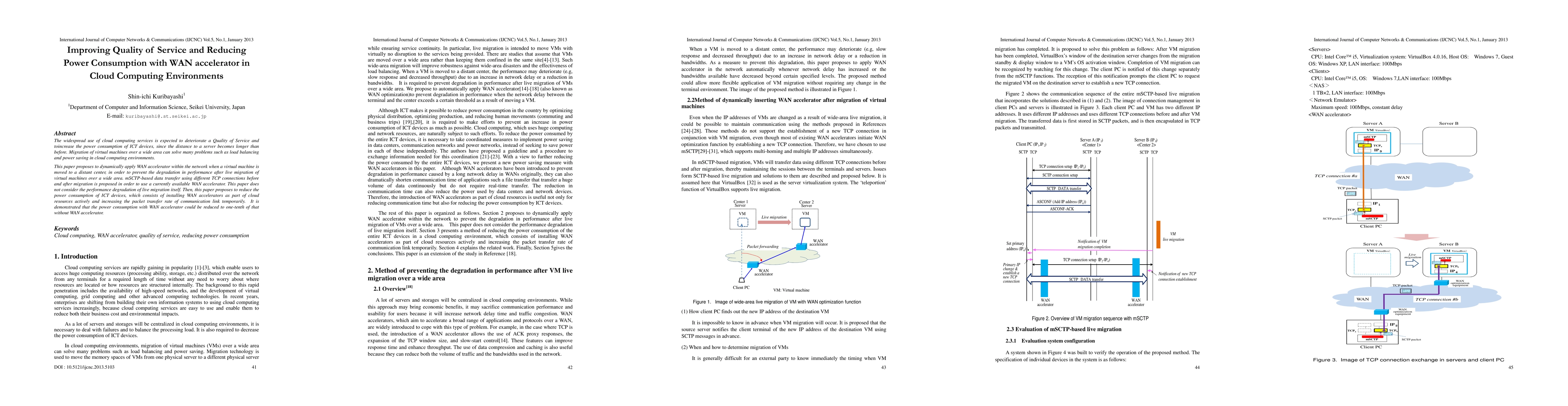 This paper proposes a dynamic WAN accelerator application to maintain Quality of Service during live migration of virtual machines over long distances in cloud computing. It also suggests using mSCTP-based data transfer and WAN accelerators to significantly reduce power consumption, achieving up to a tenfold reduction compared to non-accelerated methods.