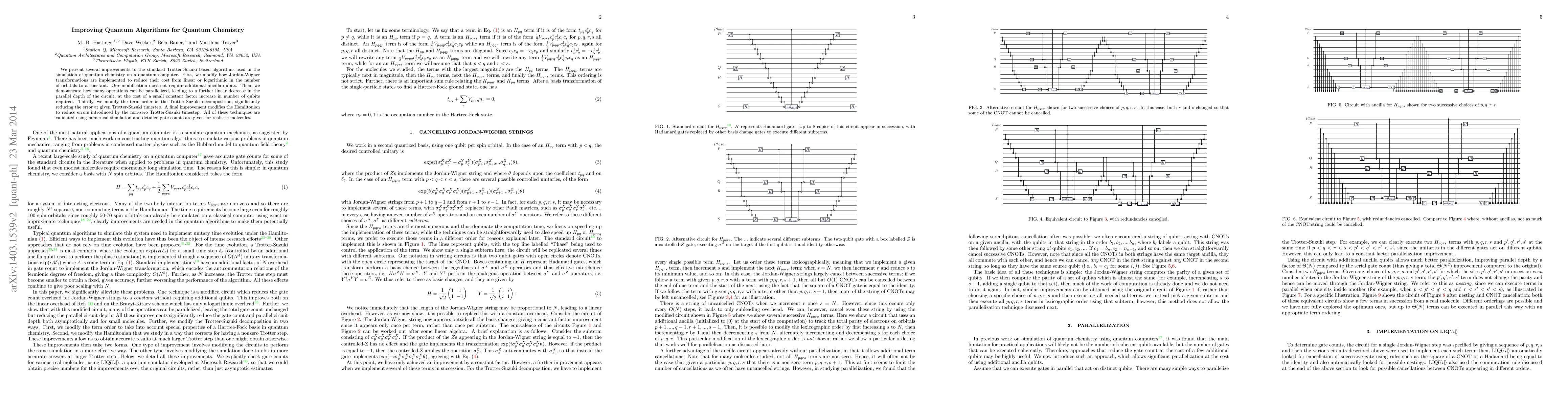 This paper proposes enhancements to quantum algorithms for quantum chemistry simulations, including constant-cost Jordan-Wigner transformations, parallelizable operations, optimized Trotter-Suzuki decomposition, and Hamiltonian modifications to reduce errors. These improvements are validated through numerical simulations and detailed gate counts.