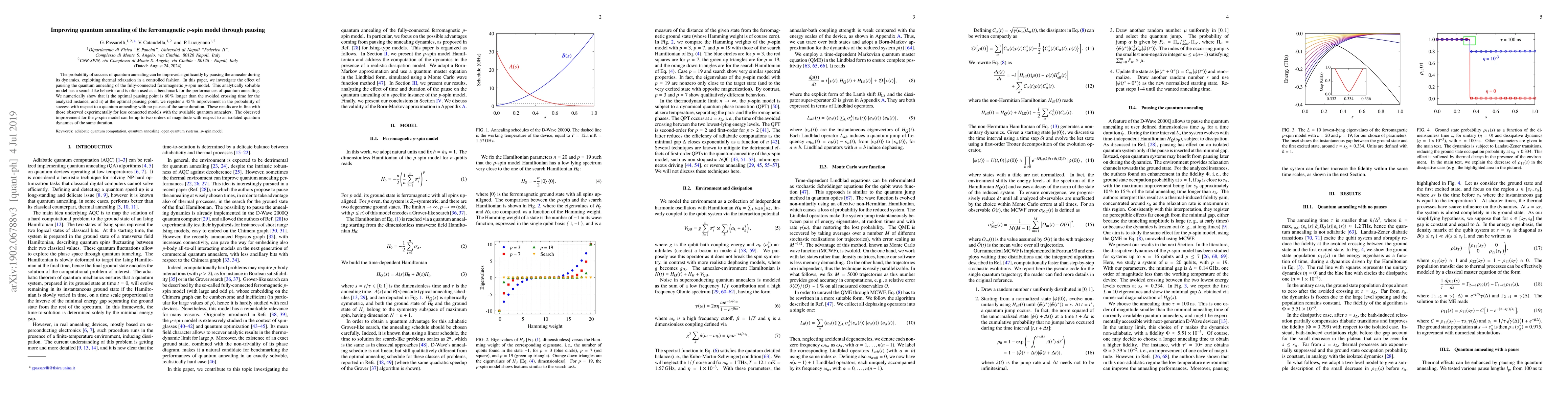 This paper investigates how pausing quantum annealing during the dynamics of the ferromagnetic $p$-spin model can significantly improve success rates, finding that optimal pausing extends the annealing time by 60% beyond the avoided crossing time, leading to a 45% increase in success probability compared to continuous annealing. The improvement aligns with experimental results for less connected models.