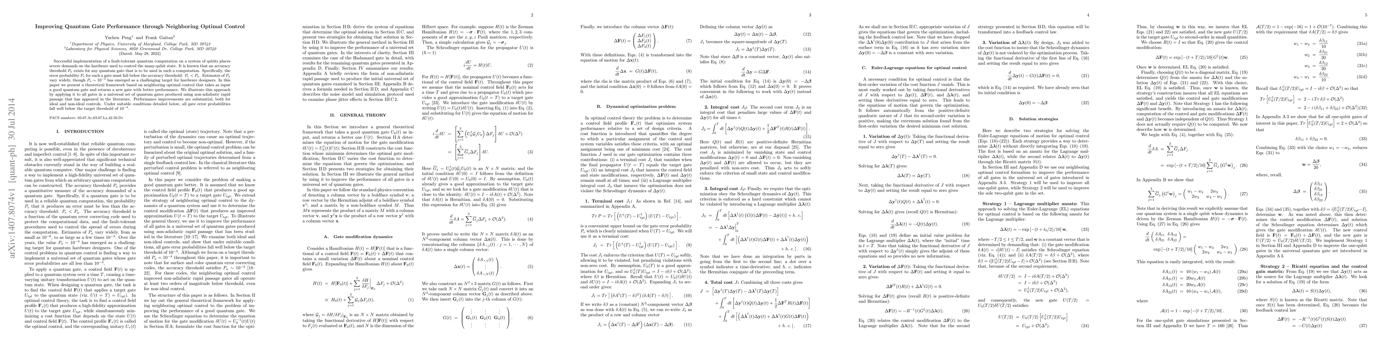 Successful implementation of a fault-tolerant quantum computation on a system of qubits places severe demands on the hardware used to control the many-qubit state. It is known that an accuracy threshold $P_{a}$ exists for any quantum gate that is to be used in such a computation. Specifically, the error probability $P_{e}$ for such a gate must fall below the accuracy threshold: $P_{e} < P_{a}$. Estimates of $P_{a}$ vary widely, though $P_{a}\sim 10^{-4}$ has emerged as a challenging target for hardware designers. In this paper we present a theoretical framework based on neighboring optimal control that takes as input a good quantum gate and returns a new gate with better performance. We illustrate this approach by applying it to all gates in a universal set of quantum gates produced using non-adiabatic rapid passage that has appeared in the literature. Performance improvements are substantial, both for ideal and non-ideal controls. Under suitable conditions detailed below, all gate error probabilities fall well below the target threshold of $10^{-4}$.