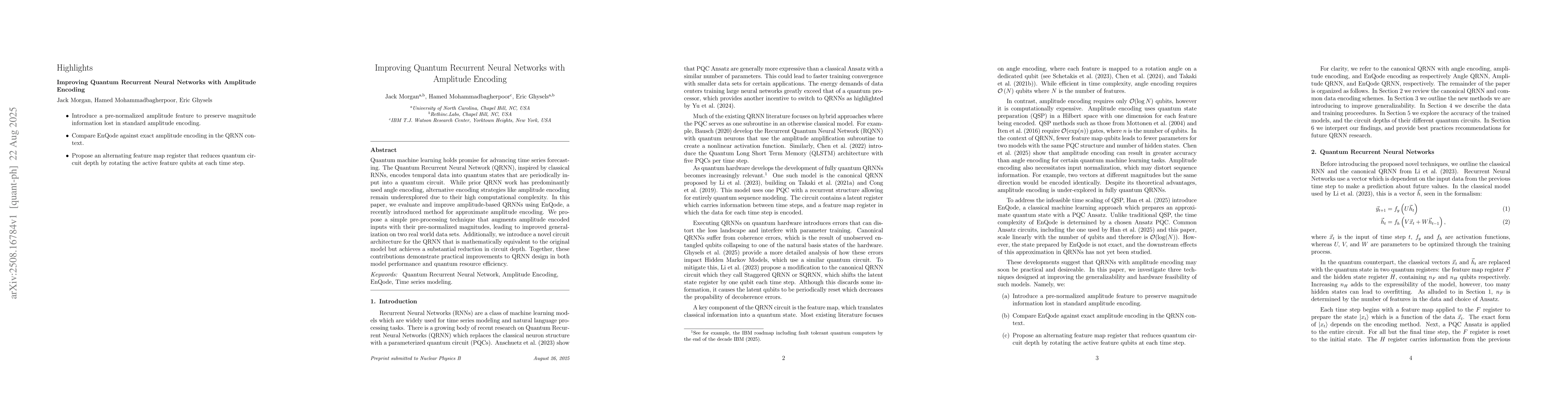 Quantum machine learning holds promise for advancing time series forecasting. The Quantum Recurrent Neural Network (QRNN), inspired by classical RNNs, encodes temporal data into quantum states that are periodically input into a quantum circuit. While prior QRNN work has predominantly used angle encoding, alternative encoding strategies like amplitude encoding remain underexplored due to their high computational complexity. In this paper, we evaluate and improve amplitude-based QRNNs using EnQode, a recently introduced method for approximate amplitude encoding. We propose a simple pre-processing technique that augments amplitude encoded inputs with their pre-normalized magnitudes, leading to improved generalization on two real world data sets. Additionally, we introduce a novel circuit architecture for the QRNN that is mathematically equivalent to the original model but achieves a substantial reduction in circuit depth. Together, these contributions demonstrate practical improvements to QRNN design in both model performance and quantum resource efficiency.