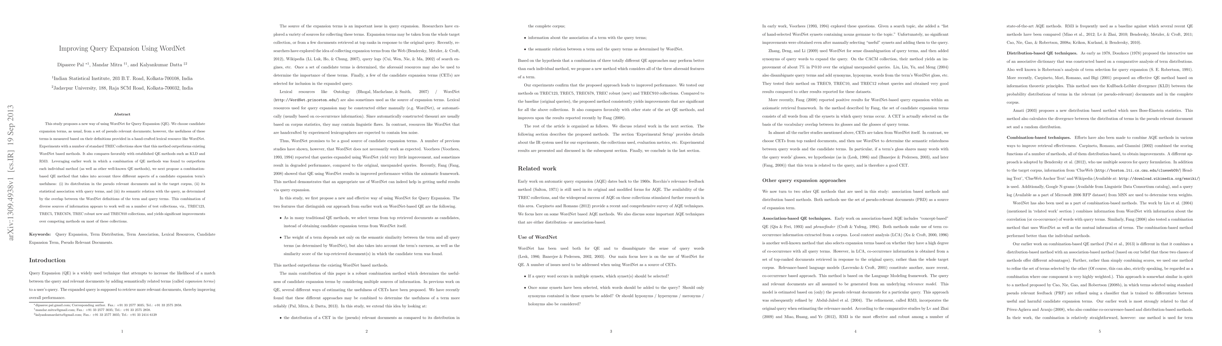 This study introduces a novel method for Query Expansion using WordNet, evaluating candidate terms based on their definitions in WordNet and combining various aspects of term usefulness to outperform existing methods. The proposed combination-based approach significantly improves results over standard collections like TREC.