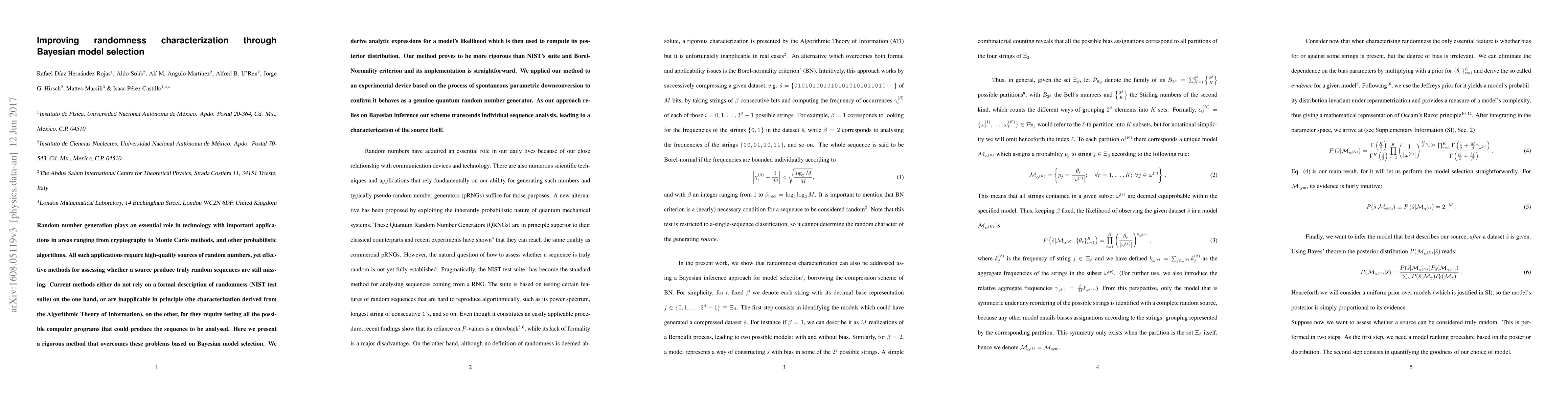 Nowadays random number generation plays an essential role in technology with important applications in areas ranging from cryptography, which lies at the core of current communication protocols, to Monte Carlo methods, and other probabilistic algorithms. In this context, a crucial scientific endeavour is to develop effective methods that allow the characterization of random number generators. However, commonly employed methods either lack formality (e.g. the NIST test suite), or are inapplicable in principle (e.g. the characterization derived from the Algorithmic Theory of Information (ATI)). In this letter we present a novel method based on Bayesian model selection, which is both rigorous and effective, for characterizing randomness in a bit sequence. We derive analytic expressions for a model's likelihood which is then used to compute its posterior probability distribution. Our method proves to be more rigorous than NIST's suite and the Borel-Normality criterion and its implementation is straightforward. We have applied our method to an experimental device based on the process of spontaneous parametric downconversion, implemented in our laboratory, to confirm that it behaves as a genuine quantum random number generator (QRNG). As our approach relies on Bayesian inference, which entails model generalizability, our scheme transcends individual sequence analysis, leading to a characterization of the source of the random sequences itself.