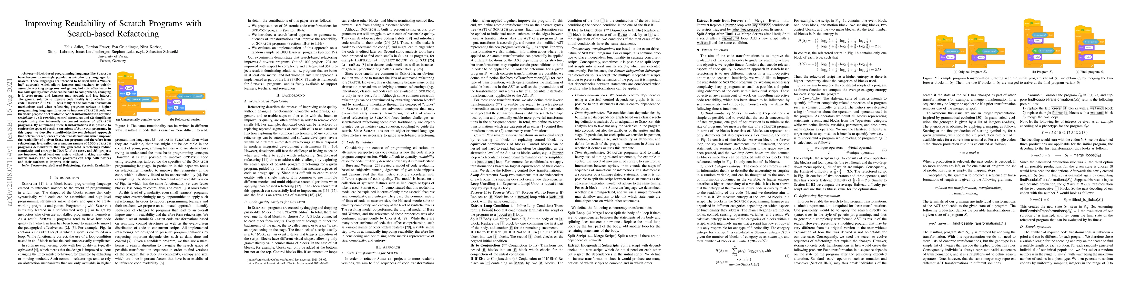This paper proposes a search-based approach to refactor Scratch programs, aiming to improve their readability by rewriting control structures and simplifying scripts. Evaluation shows that the method effectively reduces complexity and entropy in over 70% of cases, enhancing code quality without worsening other metrics.