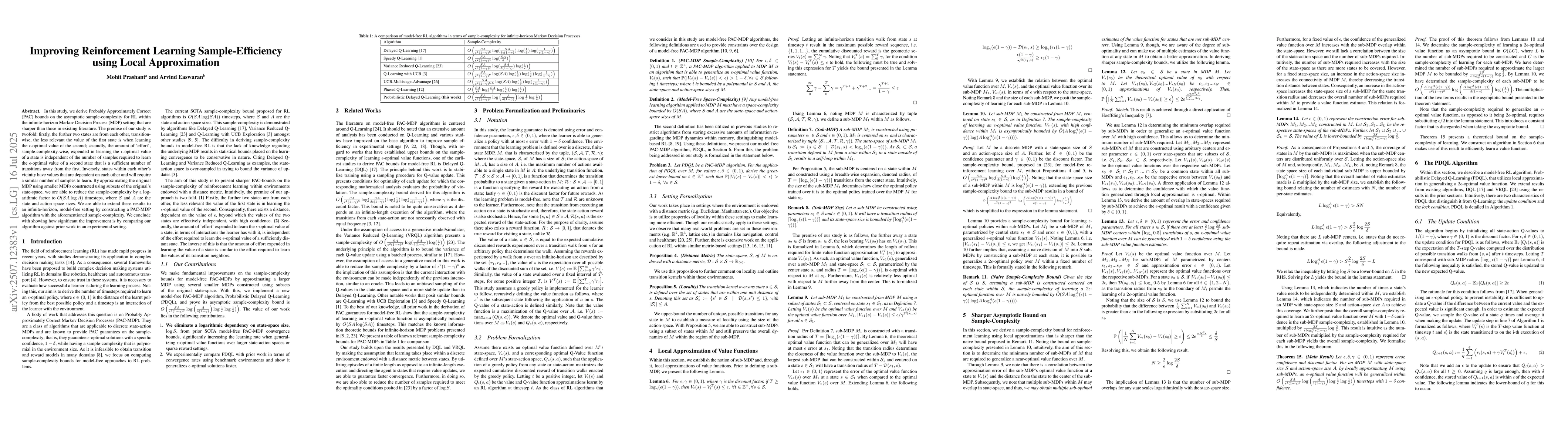 In this study, we derive Probably Approximately Correct (PAC) bounds on the asymptotic sample-complexity for RL within the infinite-horizon Markov Decision Process (MDP) setting that are sharper than those in existing literature. The premise of our study is twofold: firstly, the further two states are from each other, transition-wise, the less relevant the value of the first state is when learning the $\epsilon$-optimal value of the second; secondly, the amount of 'effort', sample-complexity-wise, expended in learning the $\epsilon$-optimal value of a state is independent of the number of samples required to learn the $\epsilon$-optimal value of a second state that is a sufficient number of transitions away from the first. Inversely, states within each other's vicinity have values that are dependent on each other and will require a similar number of samples to learn. By approximating the original MDP using smaller MDPs constructed using subsets of the original's state-space, we are able to reduce the sample-complexity by a logarithmic factor to $O(SA \log A)$ timesteps, where $S$ and $A$ are the state and action space sizes. We are able to extend these results to an infinite-horizon, model-free setting by constructing a PAC-MDP algorithm with the aforementioned sample-complexity. We conclude with showing how significant the improvement is by comparing our algorithm against prior work in an experimental setting.