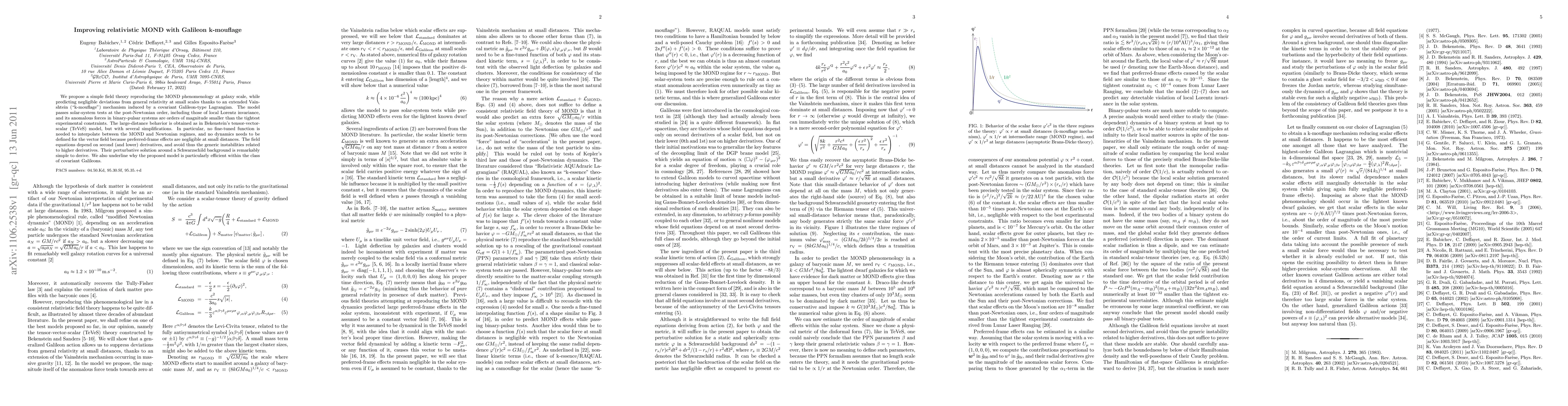 We propose a simple field theory reproducing the MOND phenomenology at galaxy scale, while predicting negligible deviations from general relativity at small scales thanks to an extended Vainshtein ("k-mouflage") mechanism induced by a covariant Galileon-type Lagrangian. The model passes solar-system tests at the post-Newtonian order, including those of local Lorentz invariance, and its anomalous forces in binary-pulsar systems are orders of magnitude smaller than the tightest experimental constraints. The large-distance behavior is obtained as in Bekenstein's tensor-vector-scalar (TeVeS) model, but with several simplifications. In particular, no fine-tuned function is needed to interpolate between the MOND and Newtonian regimes, and no dynamics needs to be defined for the vector field because preferred-frame effects are negligible at small distances. The field equations depend on second (and lower) derivatives, and avoid thus the generic instabilities related to higher derivatives. Their perturbative solution around a Schwarzschild background is remarkably simple to derive. We also underline why the proposed model is particularly efficient within the class of covariant Galileons.