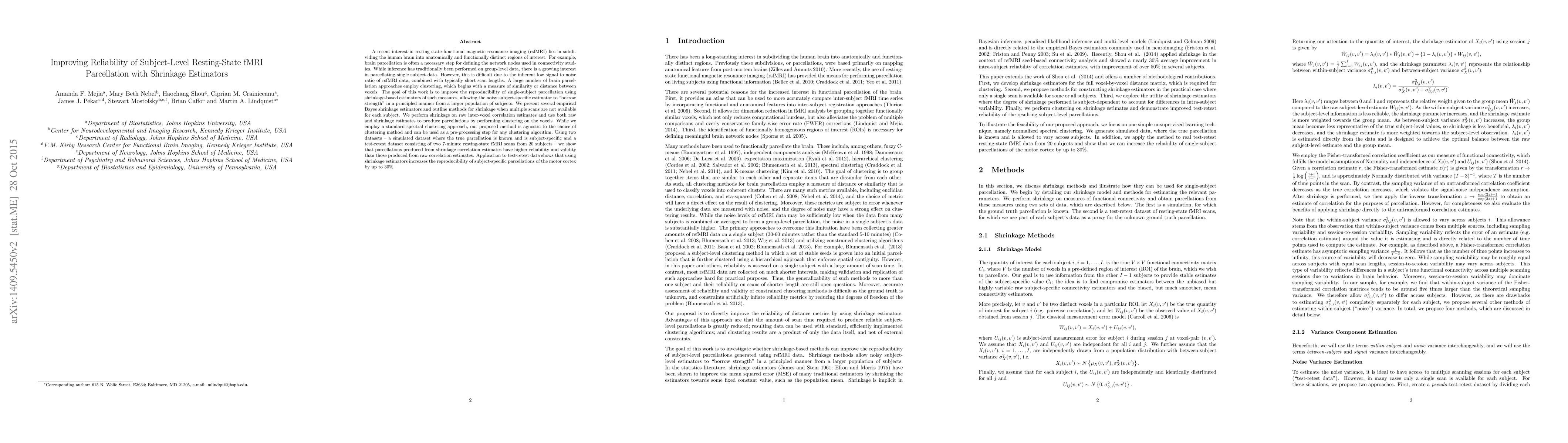 This paper proposes shrinkage estimators to improve the reliability of single-subject resting-state fMRI parcellation by borrowing strength from a larger population. The method enhances reproducibility and validity of parcellations, demonstrated through simulations and test-retest data, showing up to a 30% increase in reproducibility for the motor cortex.