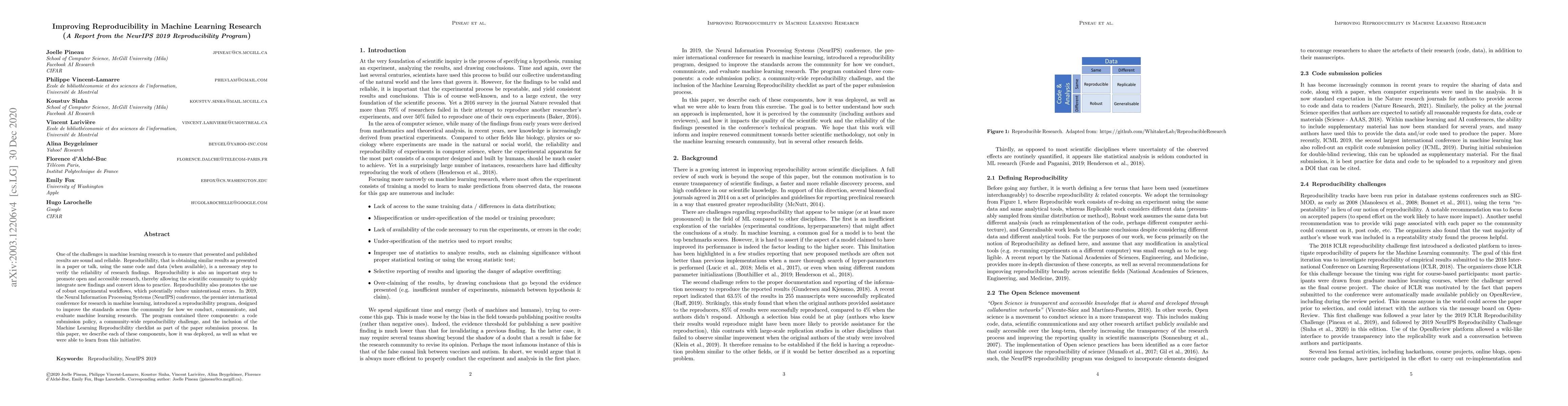 This paper discusses the NeurIPS 2019 Reproducibility Program, which aimed to enhance the reliability and openness of machine learning research by promoting reproducibility through code submission, community challenges, and a reproducibility checklist. The initiative sought to establish robust experimental workflows and facilitate the integration of new findings within the scientific community.