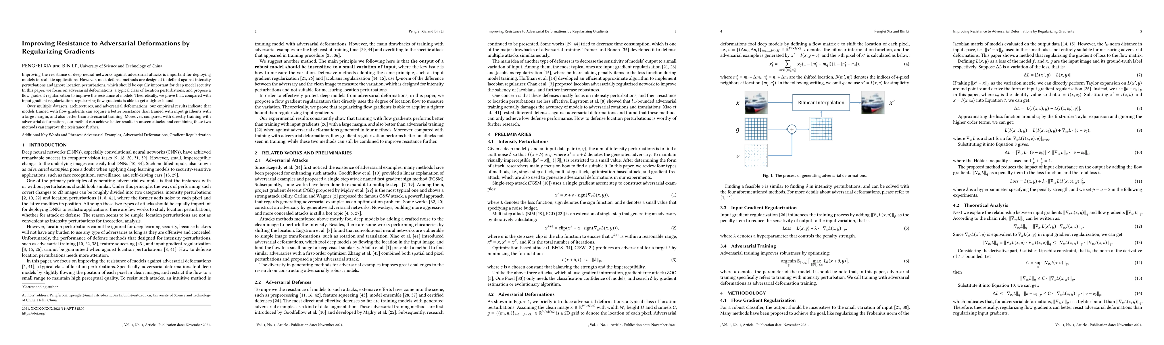 Improving the resistance of deep neural networks against adversarial attacks is important for deploying models to realistic applications. However, most defense methods are designed to defend against intensity perturbations and ignore location perturbations, which should be equally important for deep model security. In this paper, we focus on adversarial deformations, a typical class of location perturbations, and propose a flow gradient regularization to improve the resistance of models. Theoretically, we prove that, compared with input gradient regularization, regularizing flow gradients is able to get a tighter bound. Over multiple datasets, architectures, and adversarial deformations, our empirical results indicate that models trained with flow gradients can acquire a better resistance than trained with input gradients with a large margin, and also better than adversarial training. Moreover, compared with directly training with adversarial deformations, our method can achieve better results in unseen attacks, and combining these two methods can improve the resistance further.