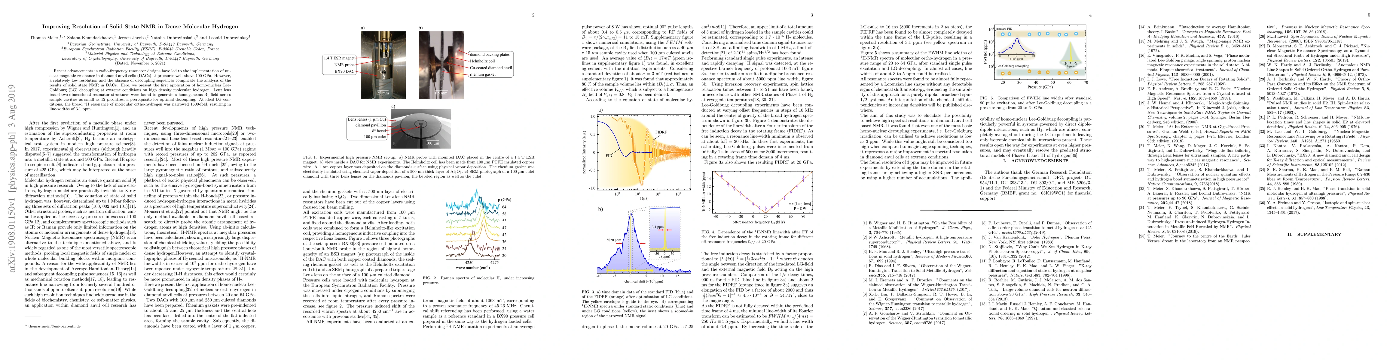 Recent advancements in radio-frequency resonator designs have led to the implementation of nuclear magnetic resonance in diamond anvil cells (DACs) at pressures well above 100 GPa. However, a relatively low resolution and the absence of decoupling sequences complicate the analysis of the results of solid state NMR in DACs. Here, we present the first application of homo-nuclear Lee-Goldburg (LG) decoupling at extreme conditions on high density molecular hydrogen. Lenz lens based two-dimensional resonator structures were found to generate a homogeneous B1 field across sample cavities as small as 12 picolitres, a prerequisite for optimal decoupling. At ideal LG conditions, the broad 1H resonance of molecular ortho-hydrogen was narrowed 1600-fold, resulting in line-widths of 3.1 ppm.