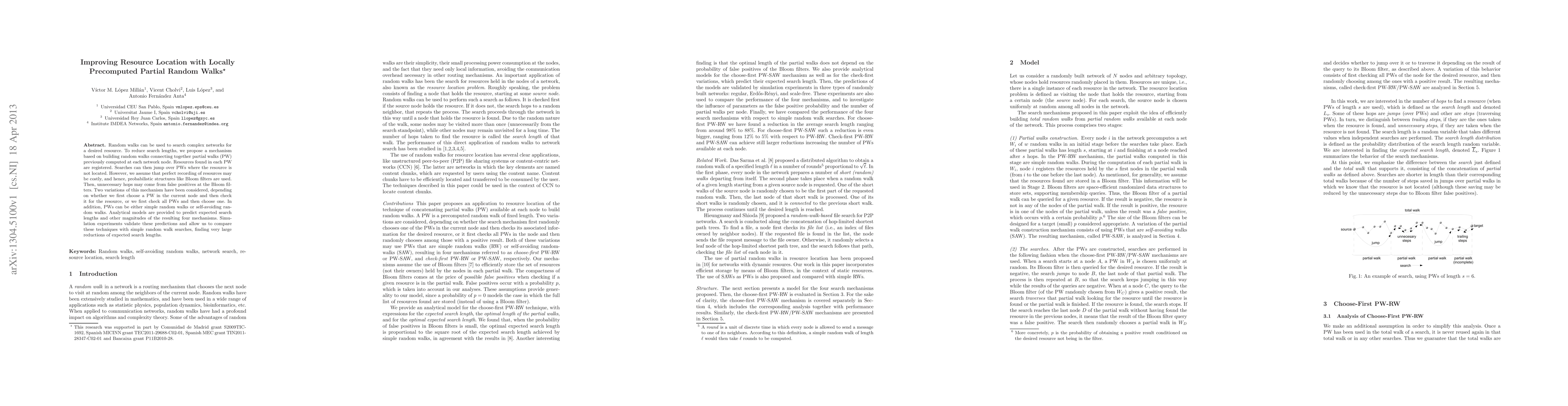 This paper proposes a method to improve resource location in complex networks using locally precomputed partial random walks, which can significantly reduce search lengths by leveraging previously computed walks and probabilistic structures like Bloom filters to manage false positives. Simulation results show substantial reductions in expected search lengths compared to simple random walk searches.