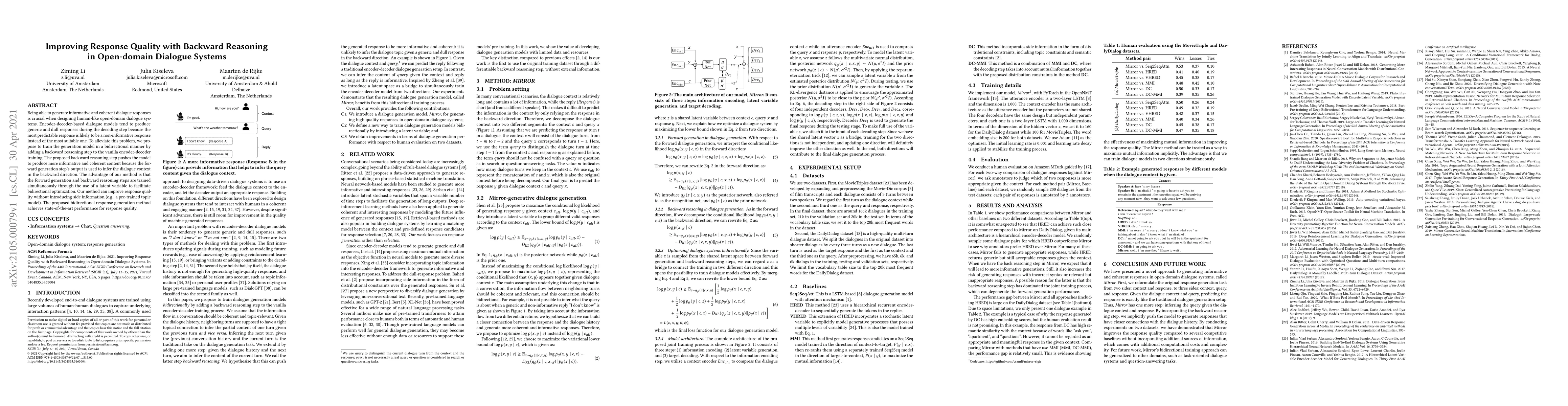 This paper proposes a bidirectional training method for open-domain dialogue systems that incorporates backward reasoning to improve response quality. The method trains the model using both forward generation and backward reasoning steps, achieving state-of-the-art performance in generating informative and coherent responses.