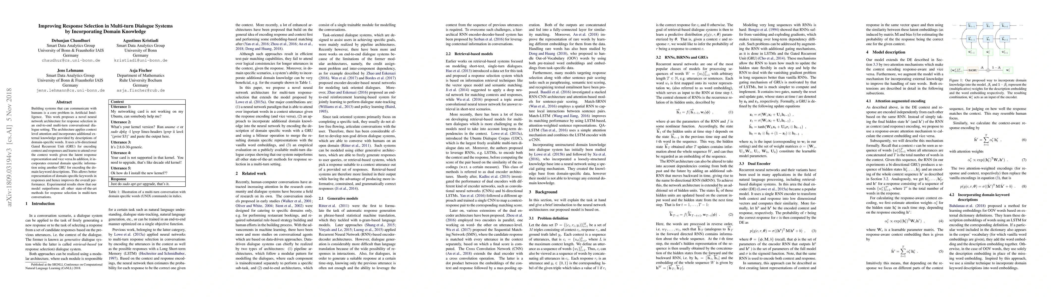 This paper proposes a neural network architecture for multi-turn dialogue response selection that uses context level attention and incorporates domain-specific knowledge to improve performance. The model integrates bi-directional GRUs for context and keyword encoding, showing superior results compared to other state-of-the-art methods.