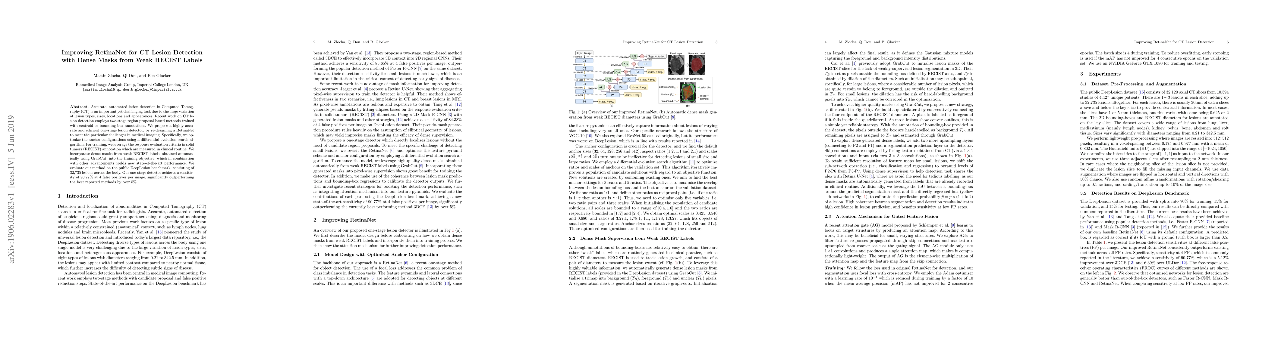 This paper proposes a one-stage lesion detector for CT scans by re-designing RetinaNet, optimizing anchor configurations, and incorporating dense masks from weak RECIST labels. The method achieves state-of-the-art performance with 90.77% sensitivity at 4 false positives per image on the DeepLesion benchmark.