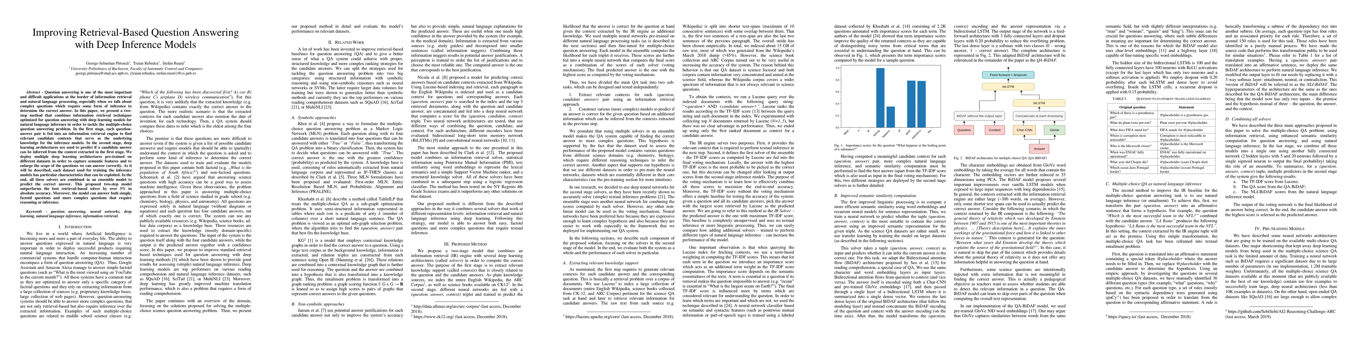 Question answering is one of the most important and difficult applications at the border of information retrieval and natural language processing, especially when we talk about complex science questions which require some form of inference to determine the correct answer. In this paper, we present a two-step method that combines information retrieval techniques optimized for question answering with deep learning models for natural language inference in order to tackle the multi-choice question answering in the science domain. For each question-answer pair, we use standard retrieval-based models to find relevant candidate contexts and decompose the main problem into two different sub-problems. First, assign correctness scores for each candidate answer based on the context using retrieval models from Lucene. Second, we use deep learning architectures to compute if a candidate answer can be inferred from some well-chosen context consisting of sentences retrieved from the knowledge base. In the end, all these solvers are combined using a simple neural network to predict the correct answer. This proposed two-step model outperforms the best retrieval-based solver by over 3% in absolute accuracy.