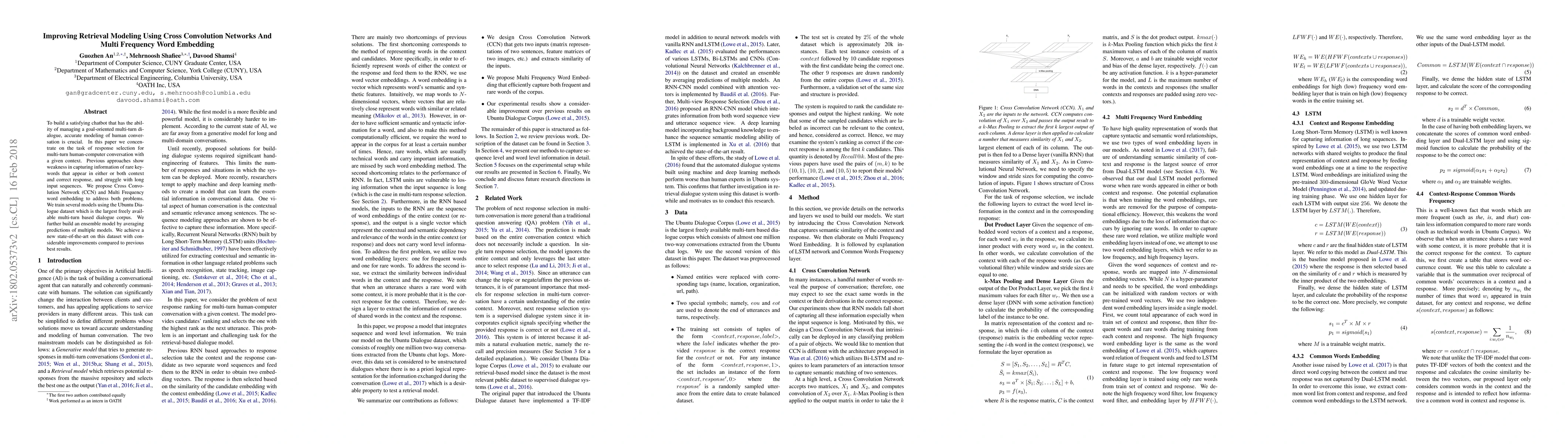 To build a satisfying chatbot that has the ability of managing a goal-oriented multi-turn dialogue, accurate modeling of human conversation is crucial. In this paper we concentrate on the task of response selection for multi-turn human-computer conversation with a given context. Previous approaches show weakness in capturing information of rare keywords that appear in either or both context and correct response, and struggle with long input sequences. We propose Cross Convolution Network (CCN) and Multi Frequency word embedding to address both problems. We train several models using the Ubuntu Dialogue dataset which is the largest freely available multi-turn based dialogue corpus. We further build an ensemble model by averaging predictions of multiple models. We achieve a new state-of-the-art on this dataset with considerable improvements compared to previous best results.