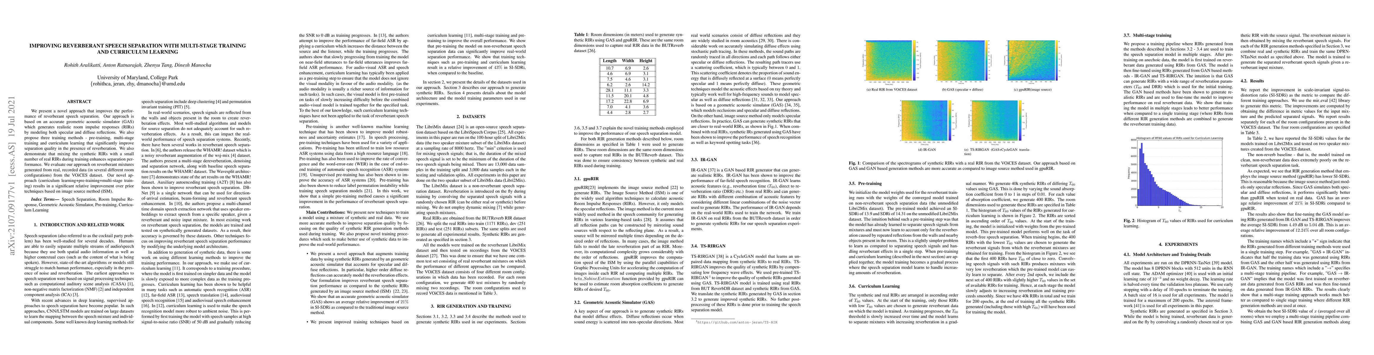 We present a novel approach that improves the performance of reverberant speech separation. Our approach is based on an accurate geometric acoustic simulator (GAS) which generates realistic room impulse responses (RIRs) by modeling both specular and diffuse reflections. We also propose three training methods - pre-training, multi-stage training and curriculum learning that significantly improve separation quality in the presence of reverberation. We also demonstrate that mixing the synthetic RIRs with a small number of real RIRs during training enhances separation performance. We evaluate our approach on reverberant mixtures generated from real, recorded data (in several different room configurations) from the VOiCES dataset. Our novel approach (curriculum learning+pre-training+multi-stage training) results in a significant relative improvement over prior techniques based on image source method (ISM).