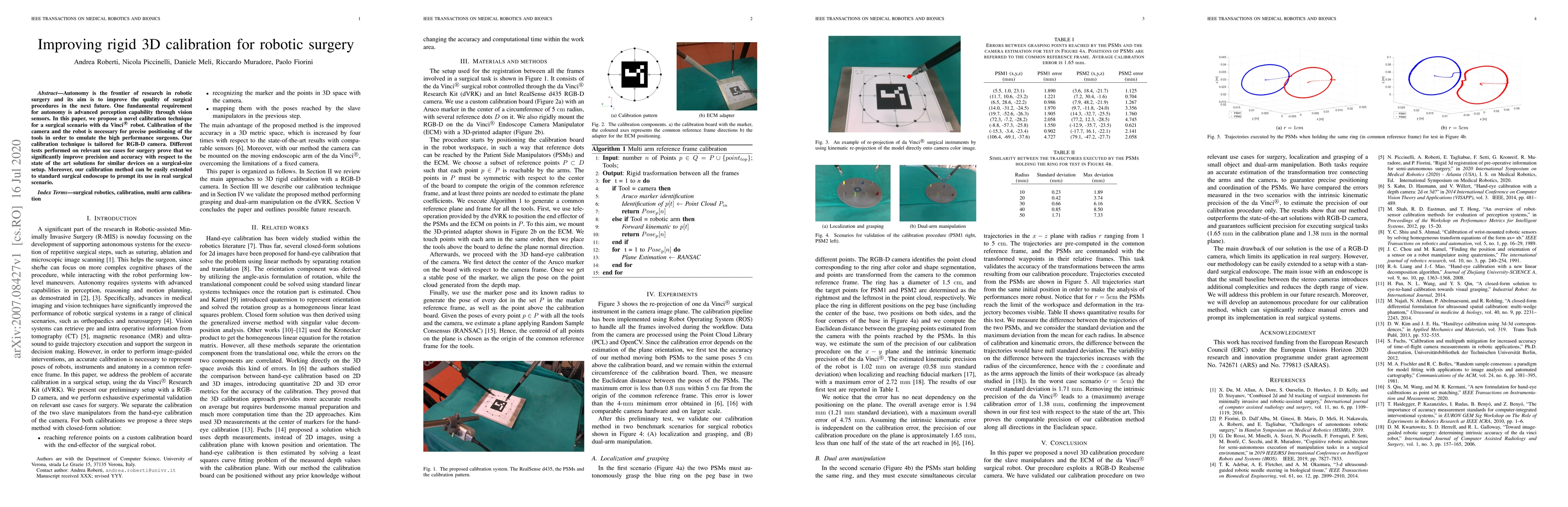 Autonomy is the frontier of research in robotic surgery and its aim is to improve the quality of surgical procedures in the next future. One fundamental requirement for autonomy is advanced perception capability through vision sensors. In this paper, we propose a novel calibration technique for a surgical scenario with da Vinci robot. Calibration of the camera and the robot is necessary for precise positioning of the tools in order to emulate the high performance surgeons. Our calibration technique is tailored for RGB-D camera. Different tests performed on relevant use cases for surgery prove that we significantly improve precision and accuracy with respect to the state of the art solutions for similar devices on a surgical-size setup. Moreover, our calibration method can be easily extended to standard surgical endoscope to prompt its use in real surgical scenario.