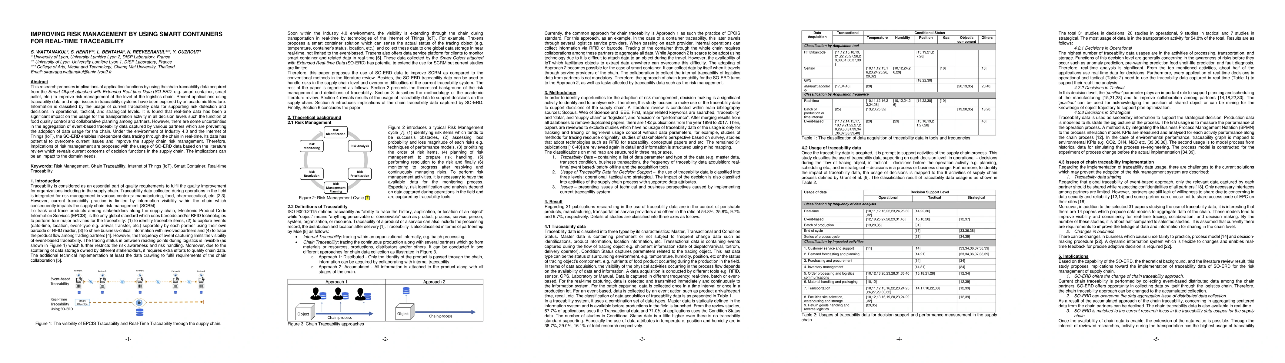 This research proposes implications of application functions by using the chain traceability data acquired from the Smart Object attached with Extended Real-time Data (SO-ERD: e.g. smart container, smart pallet, etc.) to improve risk management at the level of the logistics chain. Recent applications using traceability data and major issues in traceability systems have been explored by an academic literature. Information is classified by the usage of current traceability data for supporting risk detection and decisions in operational, tactical, and strategical levels. It is found that real-time data has been a significant impact on the usage for the transportation activity in all decision levels such the function of food quality control and collaborative planning among partners. However, there are some uncertainties in the aggregation of event-based traceability data captured by various partners which are preventing the adoption of data usage for the chain. Under the environment of Industry 4.0 and the Internet of Things (IoT), the SO-ERD enables independent data tracing through the chain in real-time. Its data has potential to overcome current issues and improve the supply chain risk management. Therefore, Implications of risk management are proposed with the usage of SO-ERD data based on the literature review which reveals current concerns of decision functions in the supply chain. The implications can be an impact to the domain needs.