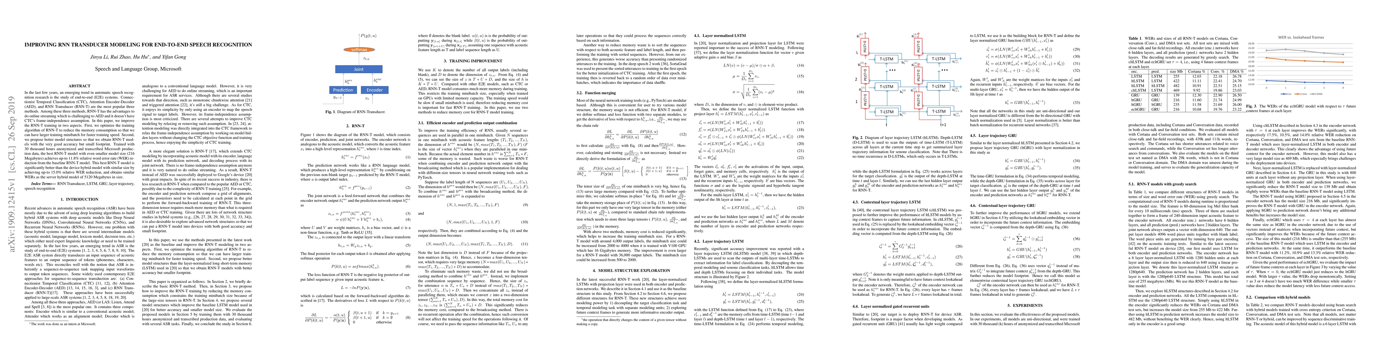 In the last few years, an emerging trend in automatic speech recognition research is the study of end-to-end (E2E) systems. Connectionist Temporal Classification (CTC), Attention Encoder-Decoder (AED), and RNN Transducer (RNN-T) are the most popular three methods. Among these three methods, RNN-T has the advantages to do online streaming which is challenging to AED and it doesn't have CTC's frame-independence assumption. In this paper, we improve the RNN-T training in two aspects. First, we optimize the training algorithm of RNN-T to reduce the memory consumption so that we can have larger training minibatch for faster training speed. Second, we propose better model structures so that we obtain RNN-T models with the very good accuracy but small footprint. Trained with 30 thousand hours anonymized and transcribed Microsoft production data, the best RNN-T model with even smaller model size (216 Megabytes) achieves up-to 11.8% relative word error rate (WER) reduction from the baseline RNN-T model. This best RNN-T model is significantly better than the device hybrid model with similar size by achieving up-to 15.0% relative WER reduction, and obtains similar WERs as the server hybrid model of 5120 Megabytes in size.
